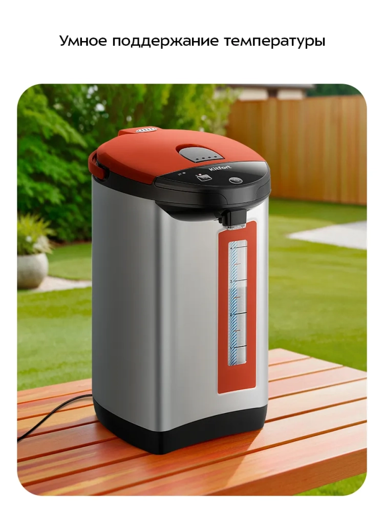 Термопот Kitfort КТ-2527 служит для кипячения воды и поддержания ее температуры воды с помощью периодического включения и отключения нагрева. Отличие термопота от обычного чайника в том, что термопот поддерживает температуру воды, поэтому она может оставаться горячей долгое время, если вам это необходимо.