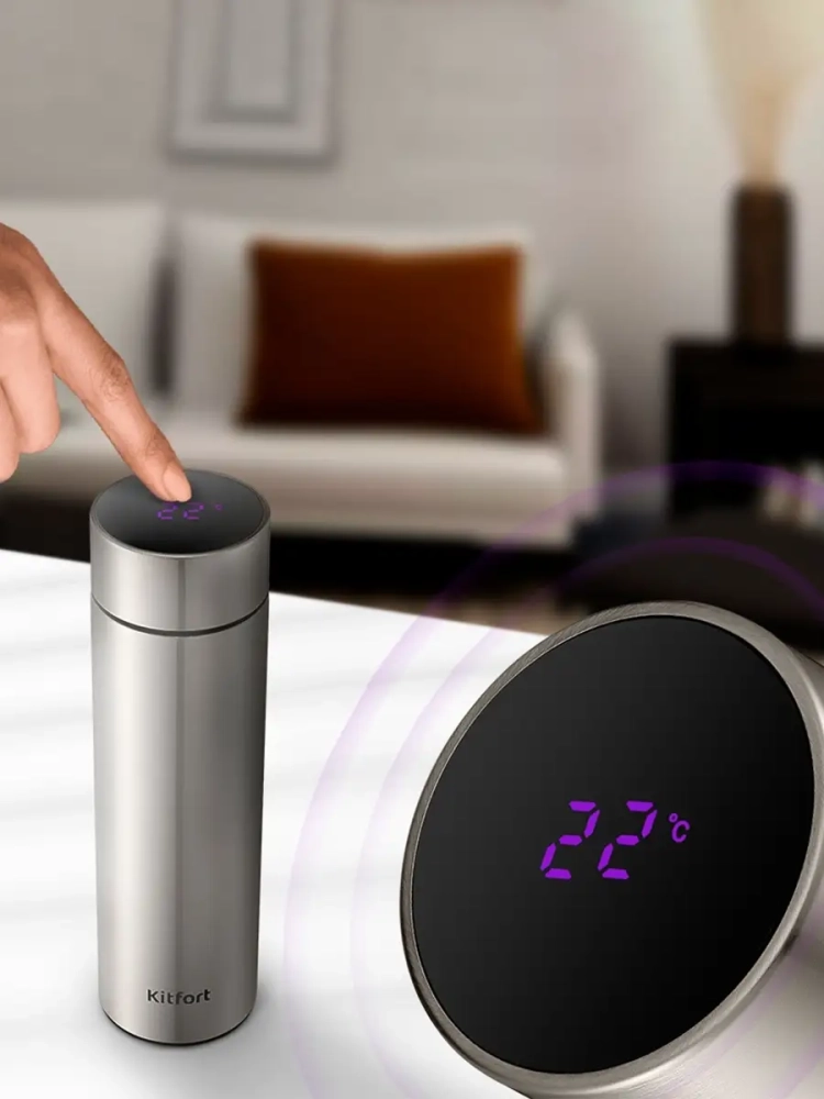 Термос Kitfort КТ-1221 - идеальный вариант для переноски горячих и холодных напитков. Главное достоинство термоса Китфорт КТ-1221 - сохранение температуры содержимого 10-12 часов. Металлический термос надежный и прочный. Крышку и термос перед первым использованием необходимо проверить на герметичность. Для этого наберите холодной воды, плотно закрутите крышку и переверните его. Крышка должна обеспечивать сохранность содержимого. В КТ-1221 навинчивающаяся крышка с силиконовым уплотнительным кольцом. Такая конструкция защищает от протеканий. На крышке располагается сенсорный дисплей, который показывает температуру напитков внутри термоса. Сеточка-фильтр позволит заварить напиток с кусочками ингредиентов. Для этого поместите их на установленную в термос сеточку-фильтр, например чайные листья или фрукты, и залейте кипяток. Термос КТ-1221 станет незаменимой вещью в длительных поездках, в походах, прогулках и в повседневной жизни.