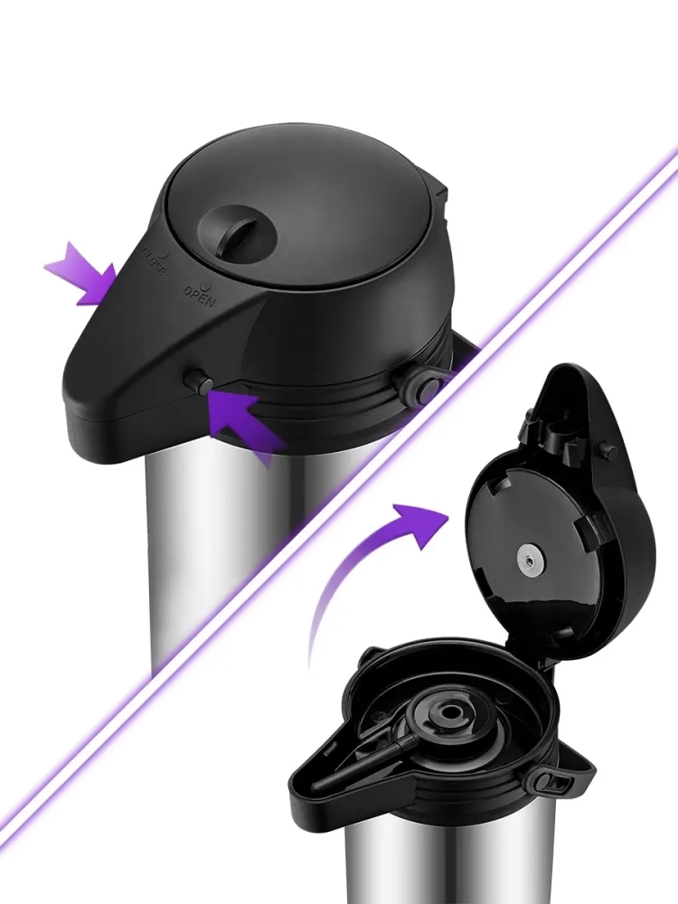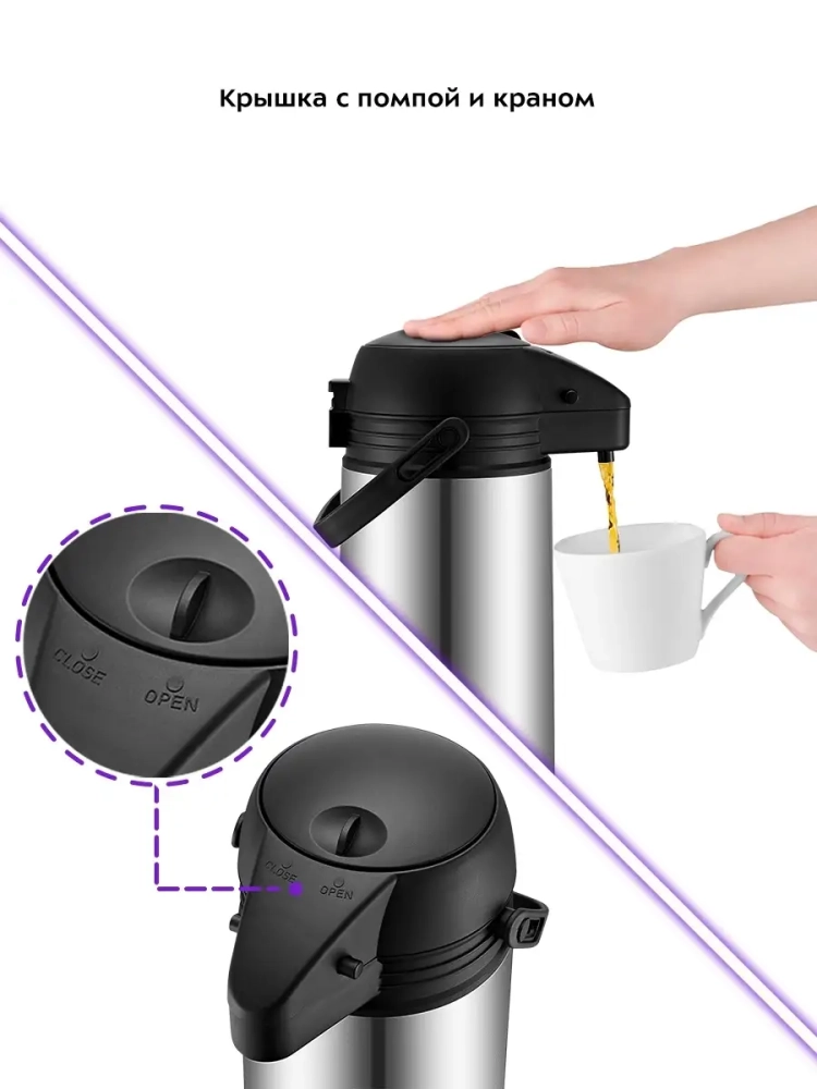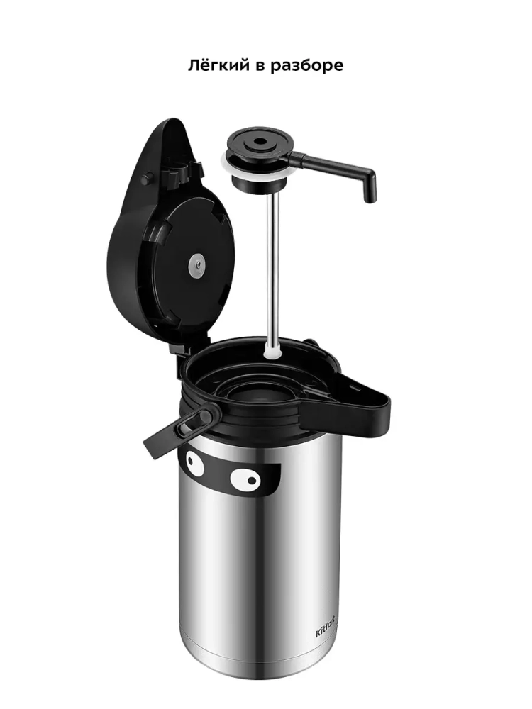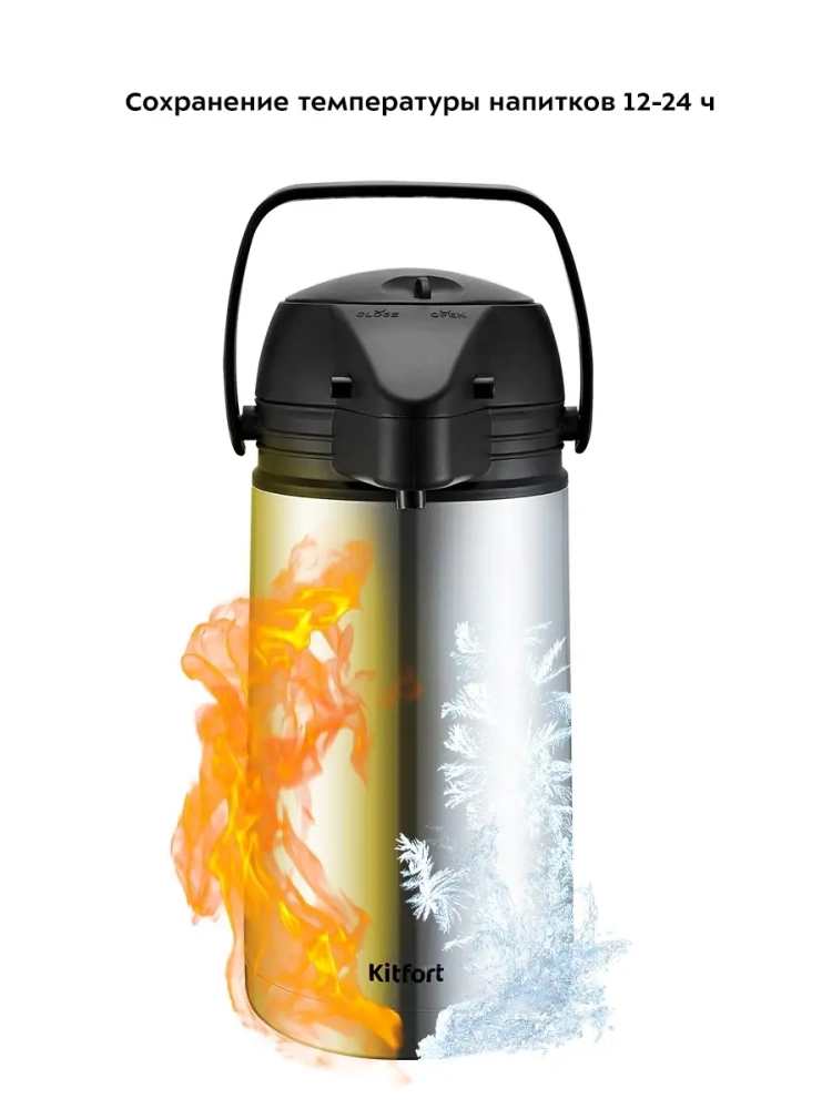 Термос Kitfort КТ-1235 с помпой и специальным носиком для наливания жидкостей. В данном термосе можно переносить как горячие, так и холодные напитки. Главное достоинство термоса Китфорт КТ-1235 - сохранение температуры содержимого 12-24 часа. Корпус и колба выполнены из нержавеющей стали. Главные преимущества термоса КТ-1235 заключаются в его компактности и легкости. Емкость термоса 1,5 л. У термоса есть крышка с удобной ручкой для переноски. В крышку встроена помпа, которую нужно нажать, и тогда напиток польется из носика. Стопорный рычаг в крышке предохраняет от случайного нажатия на помпу. Крышку и термос перед первым использованием необходимо проверить на герметичность. Для этого наберите холодной воды, закройте крышку, установите стопорный рычаг в положение CLOSE и переверните термос. Крышка должна обеспечивать сохранность содержимого. Термос КТ-1235 станет незаменимой вещью в длительных поездках, в походах, прогулках и в повседневной жизни.