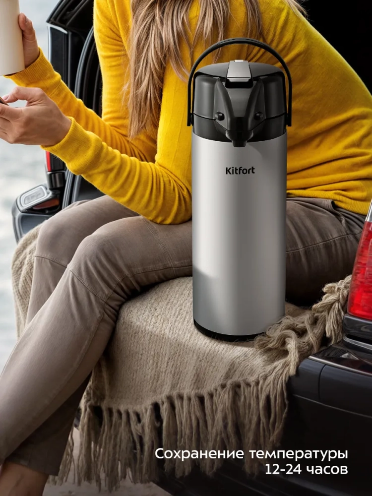 У изделия есть удобная ручка для переноски. При необходимости вы можете повернуть носик, не поднимая термос: на дне корпуса предусмотрен поворотный механизм. Данная модель предназначена для стационарного использования и будет незаменима во время отдыха на свежем воздухе, а также на кухне в офисе, квартире или на даче.
