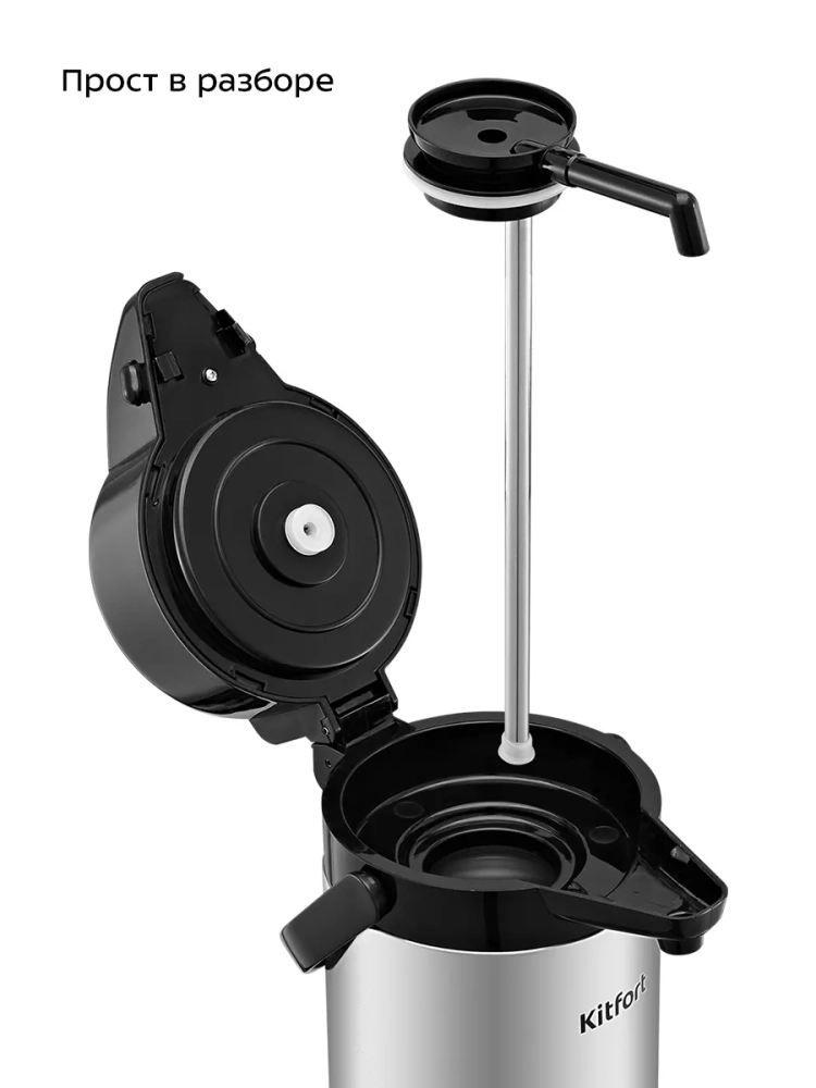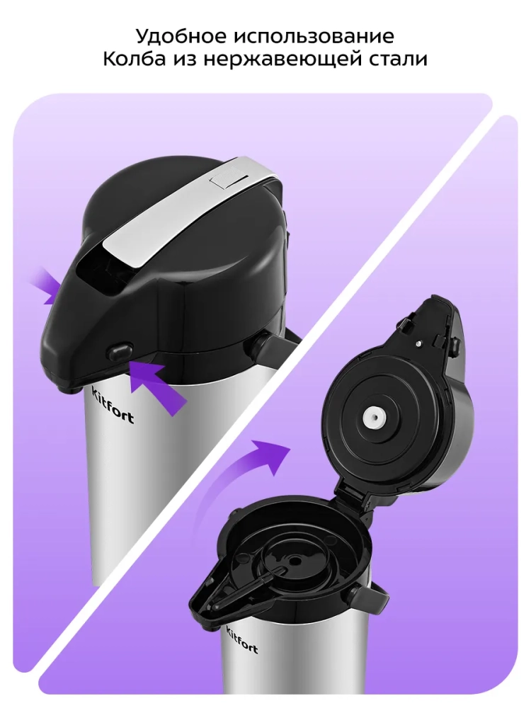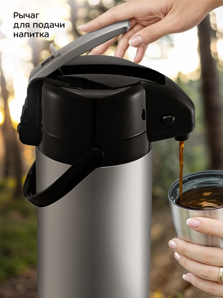 Для подачи напитка из колбы термос оборудован помпой и специальным носиком. Такая конструкция позволяет не открывать колбу при наливании жидкости, благодаря чему температура внутри колбы сохраняется дольше. Для подачи напитка нужно нажимать на помпу с помощью рычага. Рычаг работает только в определенном положении, что защищает от случайного проливания напитка.