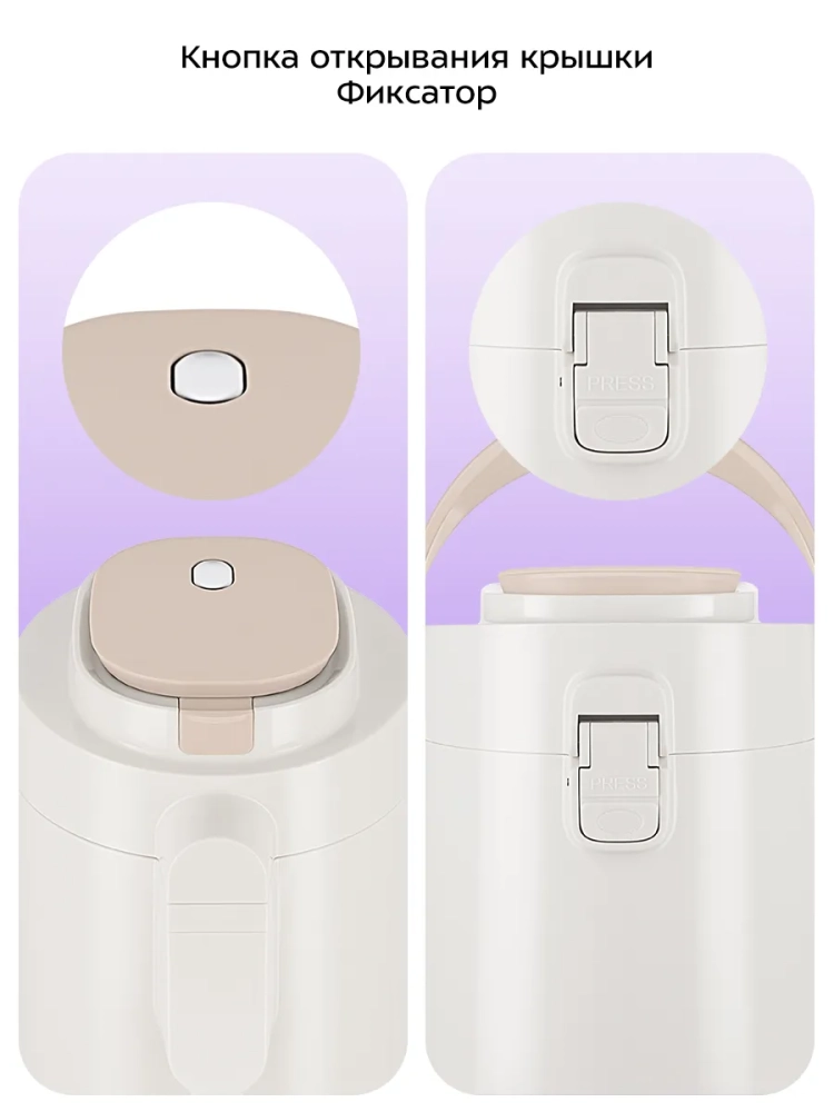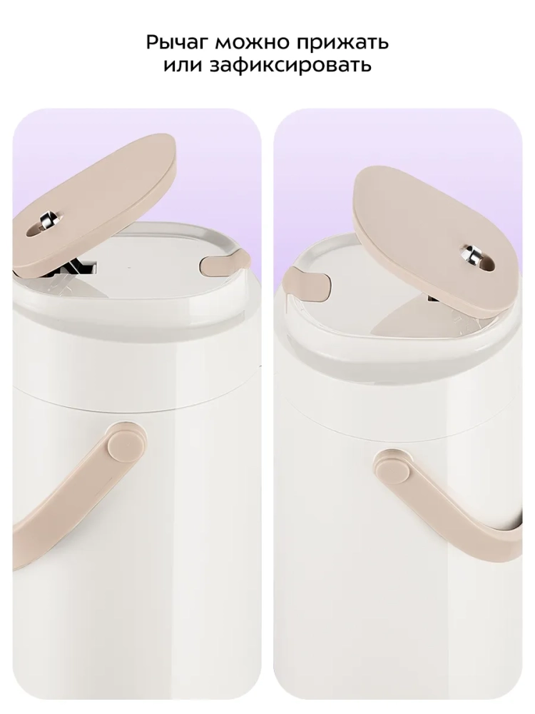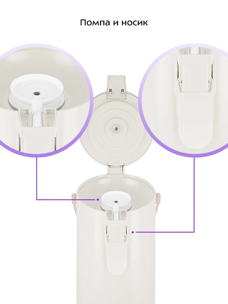 Для подачи напитка из колбы термос оборудован помпой и специальным носиком. Такая конструкция позволяет не открывать колбу при наливании жидкости, благодаря чему температура внутри колбы сохраняется дольше. Для подачи напитка нужно нажимать на помпу с помощью рычага. Рычаг работает только в определенном положении, что защищает от случайного проливания напитка.