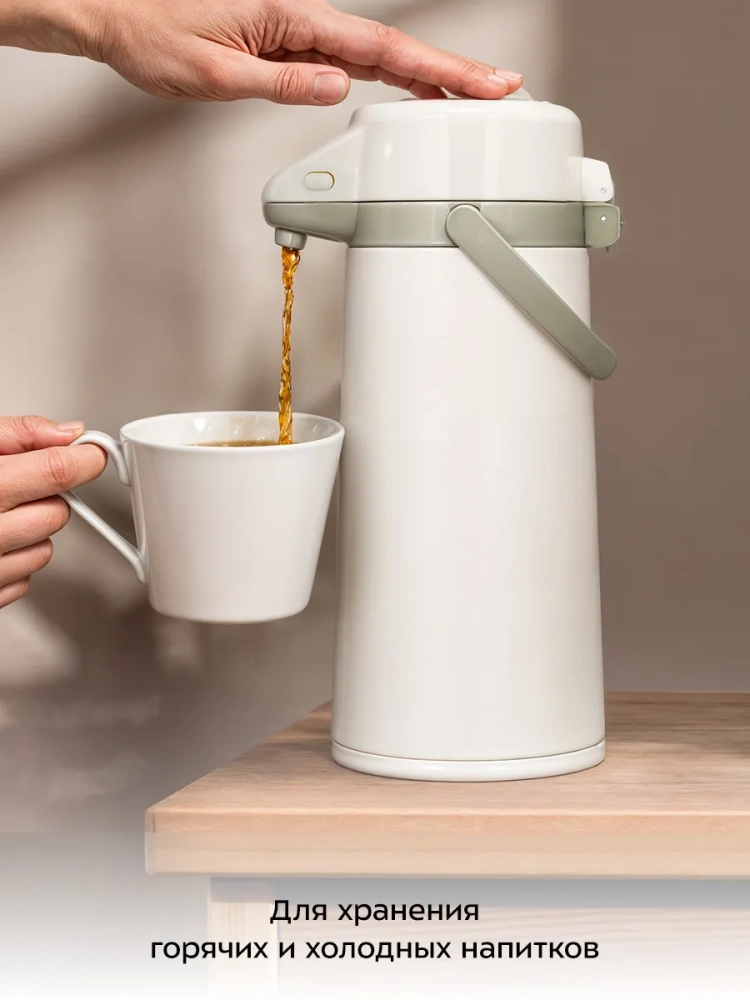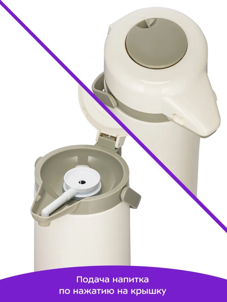 Для подачи напитка из колбы термос оборудован помпой и специальным носиком. Такая конструкция позволяет не открывать колбу при наливании жидкости, благодаря чему температура внутри колбы сохраняется дольше. Для подачи напитка нужно нажимать на помпу с помощью рычага. Рычаг работает только в определенном положении, что защищает от случайного проливания напитка.