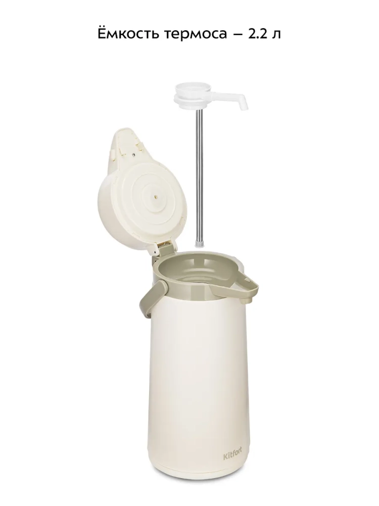 Емкость термоса — 2,2 л. Колба из стекла хорошо сохраняет температуру. Корпус и крышка изделия выполнены из пластика, что делает термос легким. Крышка термоса съемная для удобства очистки и заполнения колбы.
