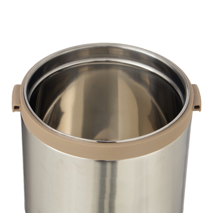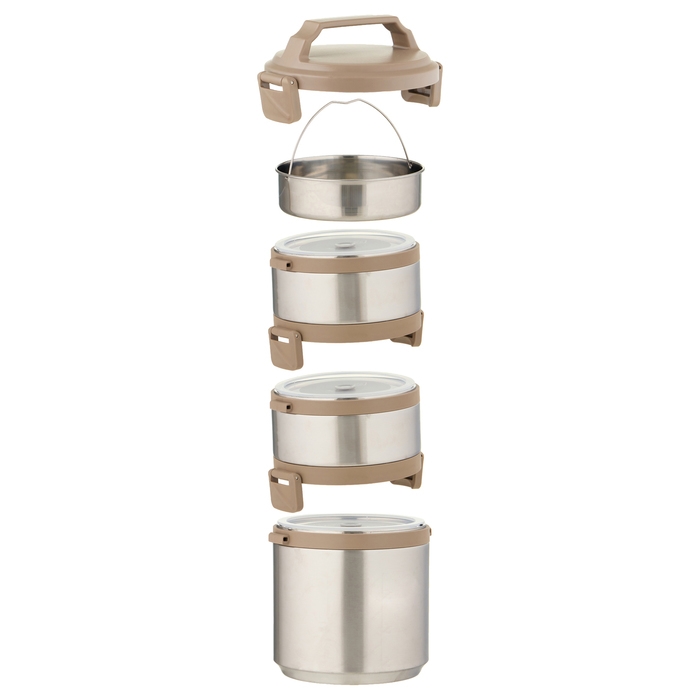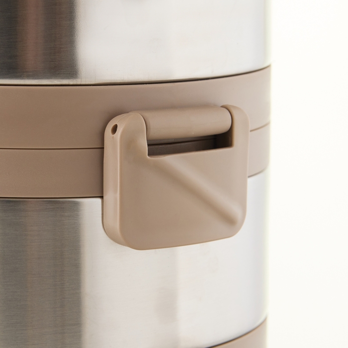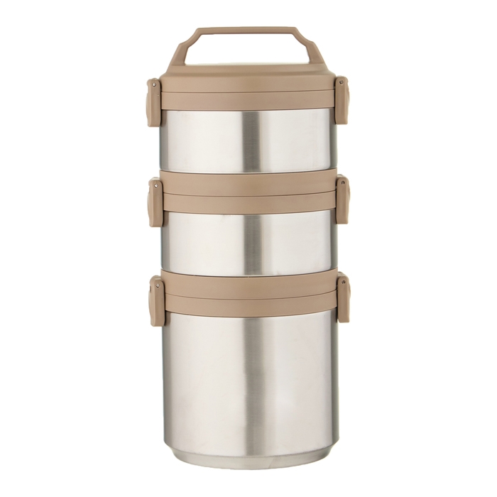 Термос изготовлен из нержавеющей стали, которая не впитывает запахи и легко моется. Оснащен нескользящим дном, которое обеспечивает устойчивость на различных поверхностях и предотвращает его перемещение во время использования. Широкое горло облегчает наполнение и чистку. Термос имеет три секции, что дает возможность удобно хранить и разогревать различные блюда. Благодаря этому вы сможете наслаждаться как горячей, так и холодной пищей в любое время и в любом месте. Помимо этого, каждая из трех секций термоса имеет крышку с удобным клапаном, который обеспечивает легкое открытие и закрытие контейнера, а также способствует герметичности. В комплекте идет складная вилка-ложка, которая прикреплена к внутренней стороне крышки, что позволяет использовать термос как полноценную посуду и не требует дополнительных приборов. А также предусмотрена ручка для комфортной транспортировки термоса.