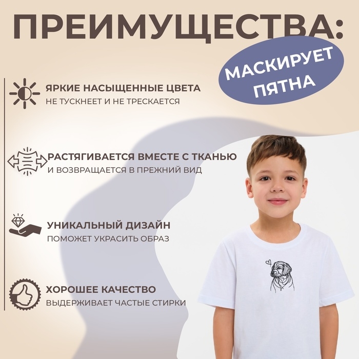 Термонаклейка «Собака с сердечком у носа» поможет сделать любую вещь уникальной и интересной. Яркий и стильный термотрансфер хорошо тянется, не трескается при растяжении и не отклеивается во время стирки. Аппликация поможет замаскировать небольшие пятна или дырочки. Подходит для нанесения практически на любую ткань и вид одежды, главное — следовать приложенной инструкции.