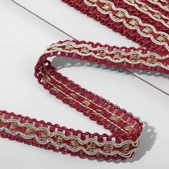 Тесьма декоративная, 16 мм, 9,1 ± 0,5 м, цвет бордовый/бежевый