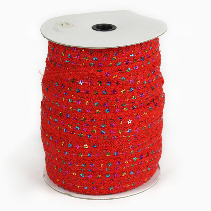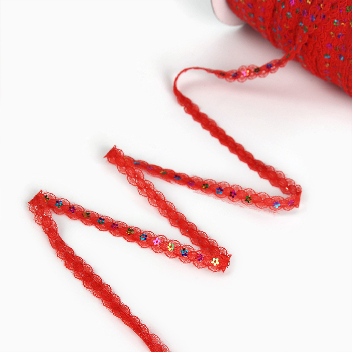 Тесьма гипюровая красная с пайетками, 1,3 см, в бобине 548 м