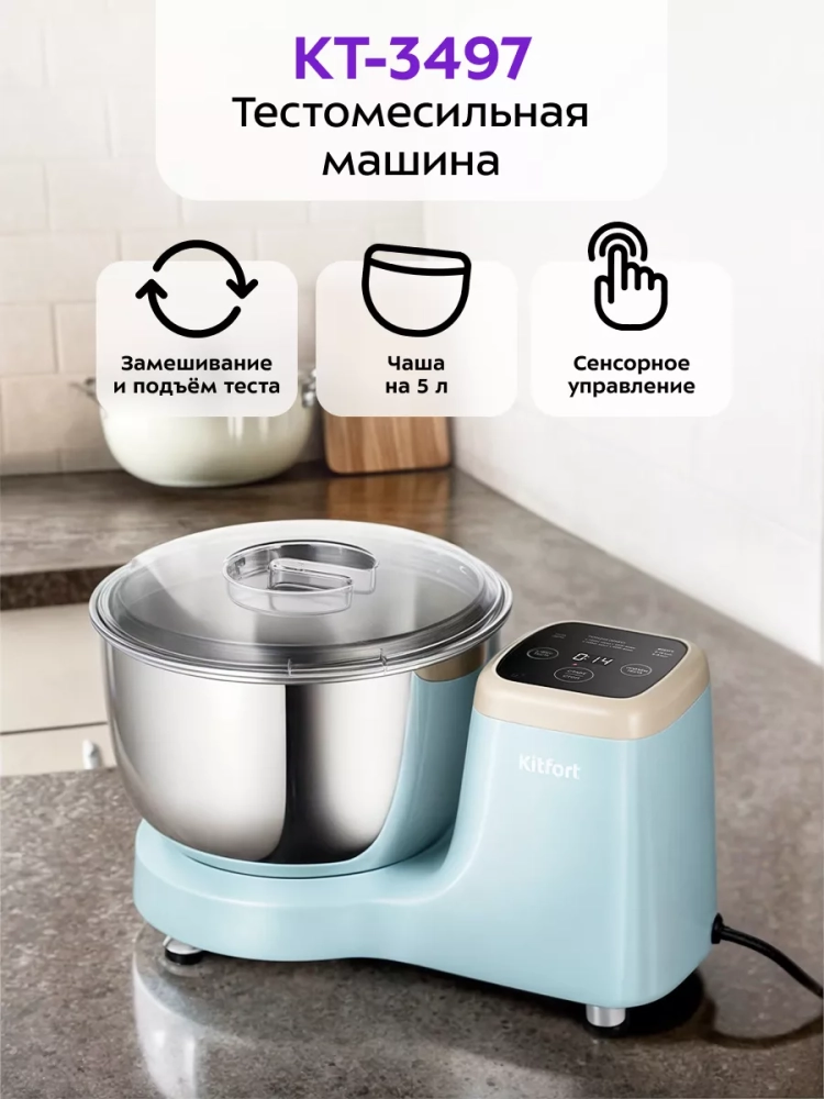 Тестомесильная машина Kitfort КТ-3497 поможет вам замесить крутое тесто для пельменей и пирогов, слоеное тесто для булочек, а также жидкое тесто для блинов.