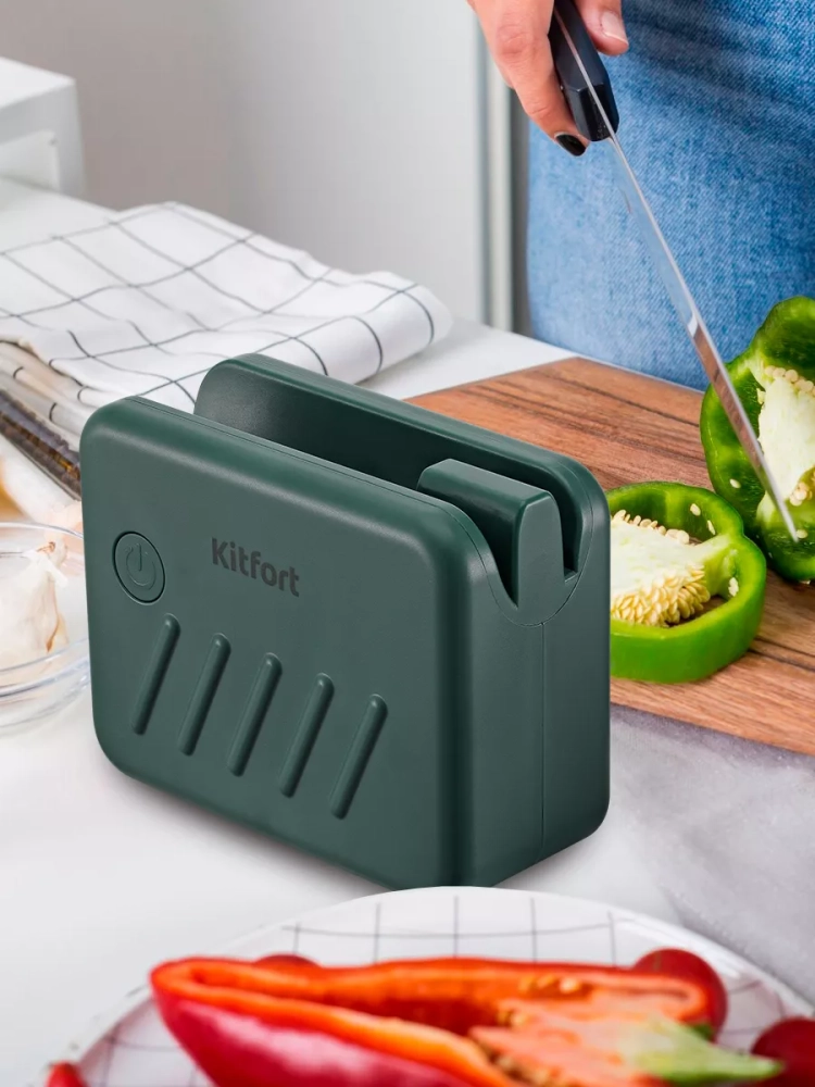 Электроточилка для ножей Kitfort КТ-6813 поможет быстро и безопасно заточить ножи с гладкими стальными лезвиями.