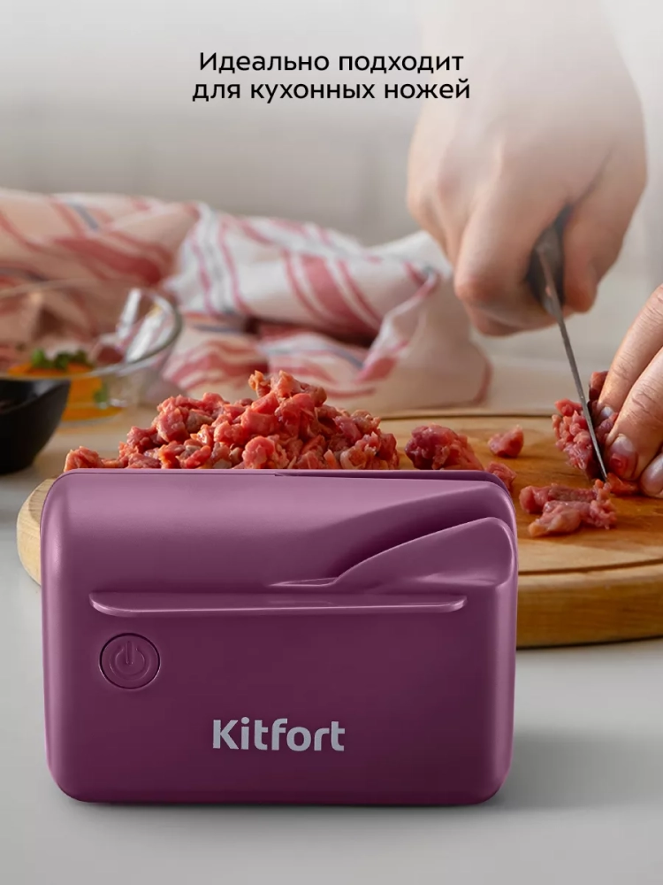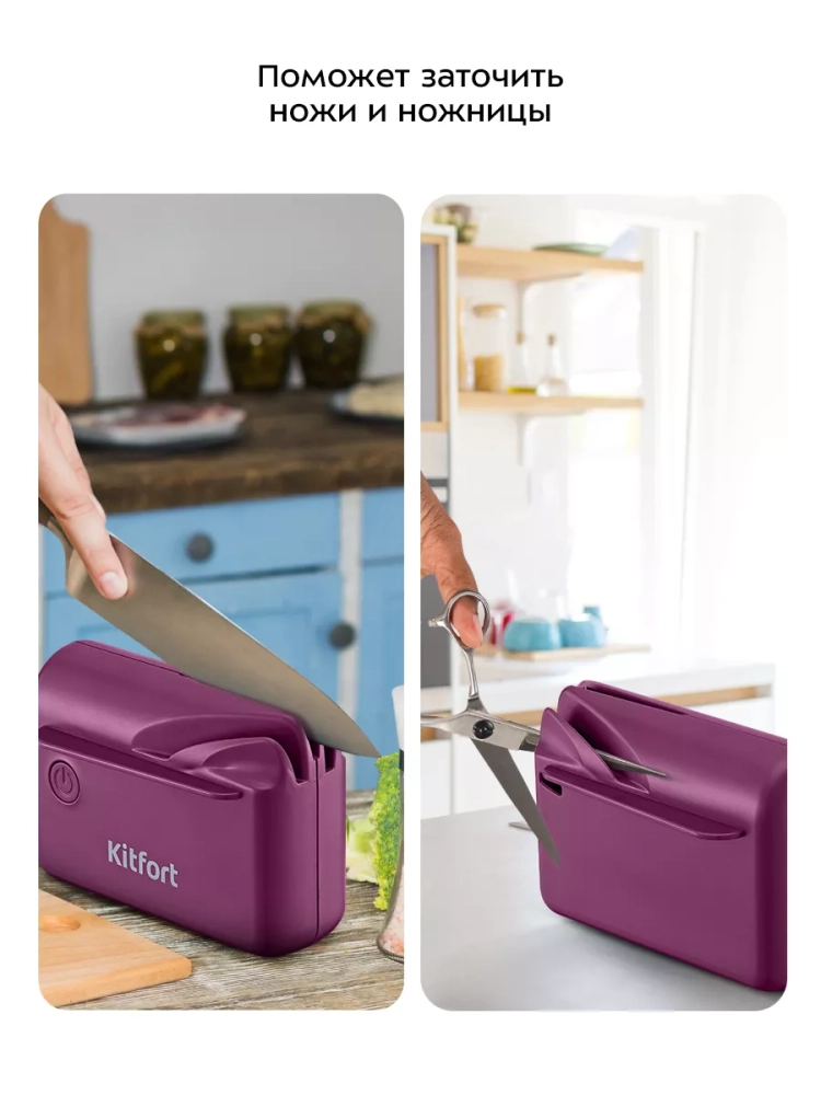 Электроточилка для ножей Kitfort КТ-6814 поможет быстро и безопасно заточить ножи с гладкими стальными лезвиями, керамические ножи, а также ножницы.