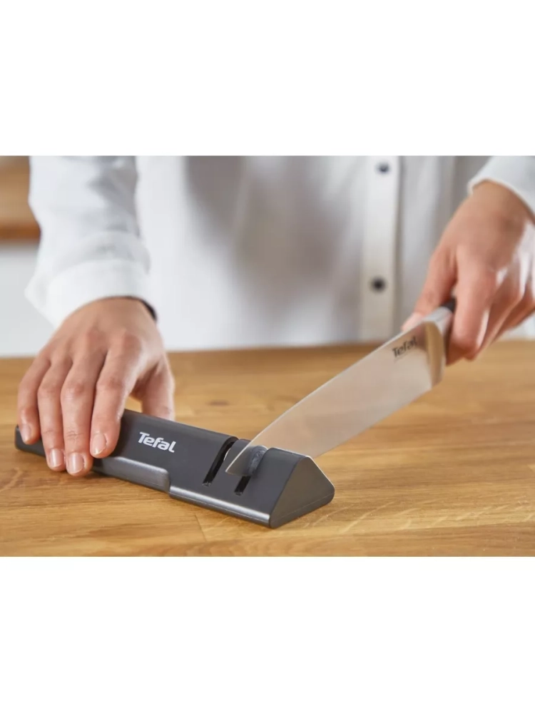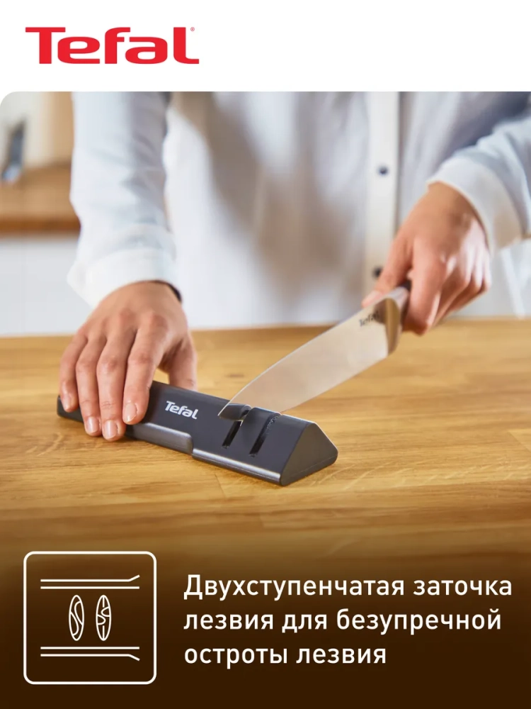 Точилка предлагает двухэтапную систему заточки: первый паз оснащен алмазным кругом, который эффективно снимает заусенцы и восстанавливает острые грани лезвия, а второй паз с керамическим кругом обеспечивает полировку, придавая ножам идеальную гладкость и блеск. Такая комбинация позволяет получить острое и ровное лезвие, как у нового ножа. Подходит для всех видов ножей из нержавеющей стали, кроме зубчатых, и не предназначена для керамических ножей и ножниц. С универсальной точилкой Tefal K2660555 ваши ножи всегда будут готовы к любым кулинарным задачам.