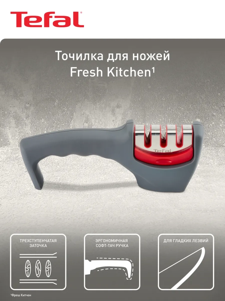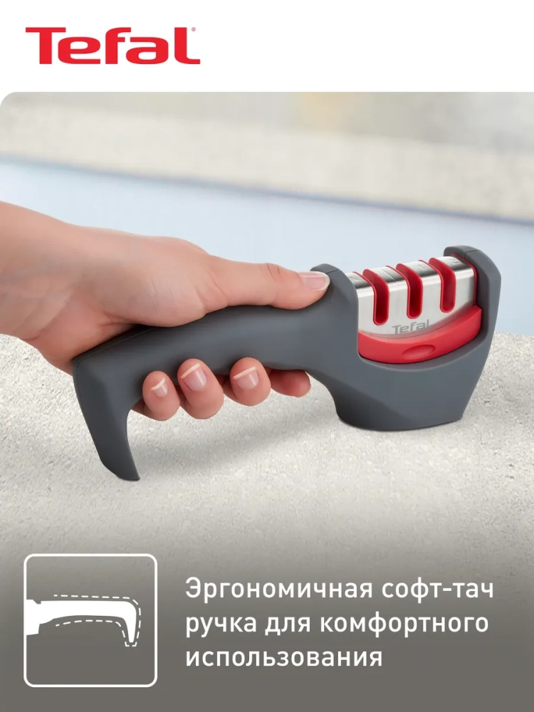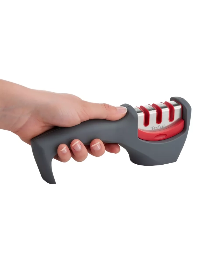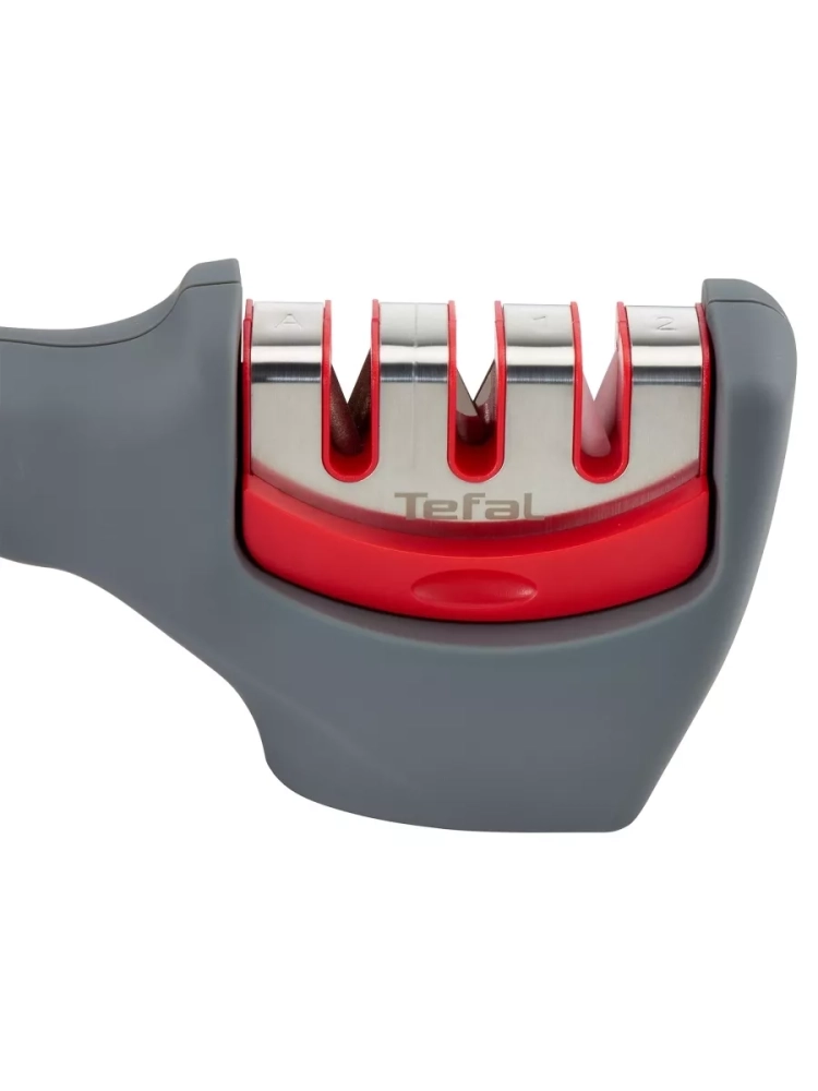 Точилка для ножей Tefal Fresh Kitchen K2090514. Заточка и уход за всеми видами ножей с лезвием из нержавеющей стали (за исключением ножей из нержавеющей стали с серрейторной заточкой, керамических ножей и ножниц). Удобная эргономичная ручка гарантирует комфорт и безопасность в процессе заточки