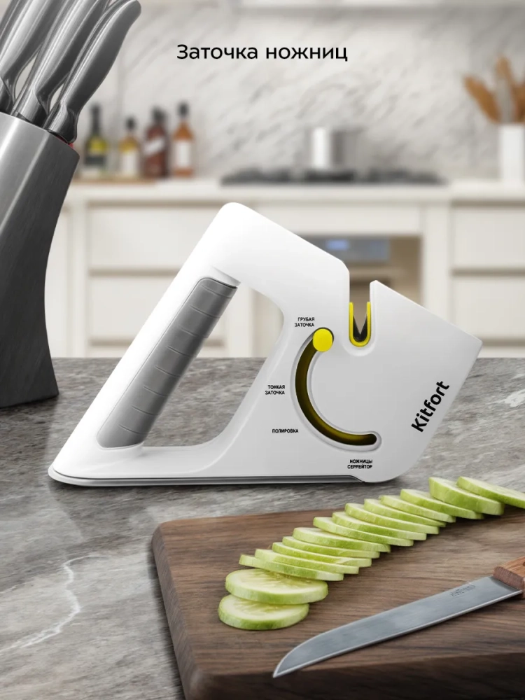 Точилка для ножей Kitfort КТ-6841 поможет быстро и безопасно заточить ножи с гладкими лезвиями, серрейторные ножи и ножницы.