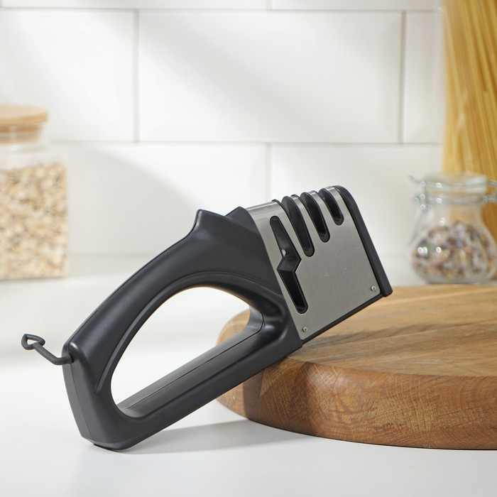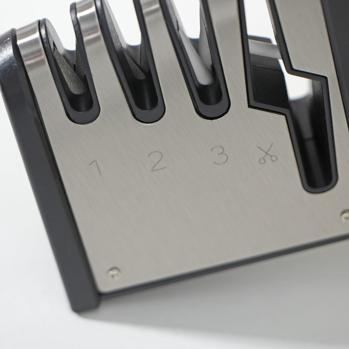 Точилка для ножей выполнена из высококачественных материалов. Она имеет 3 слота для заточки и правки ножей, а также нескользящее основание.