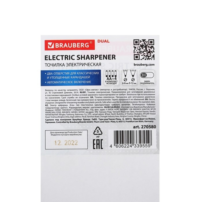 Точилка электрическая 2 отверстия BRAUBERG DUAL, питание от 4 батареек АА, голубая 270578
