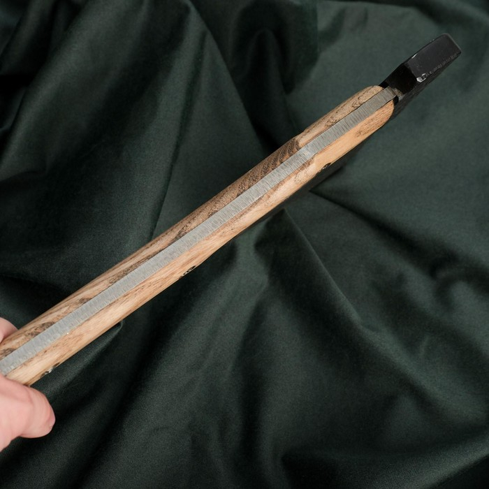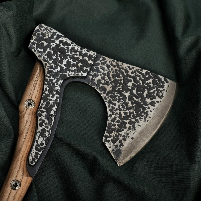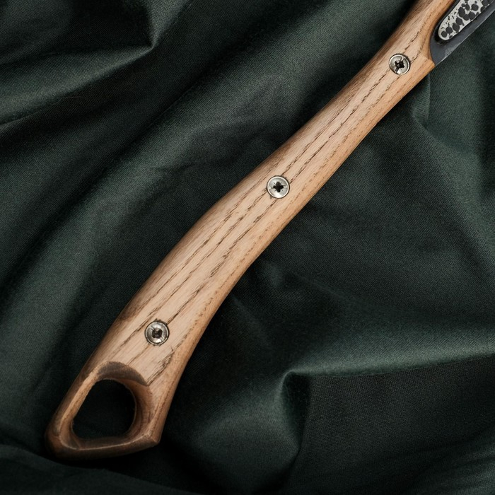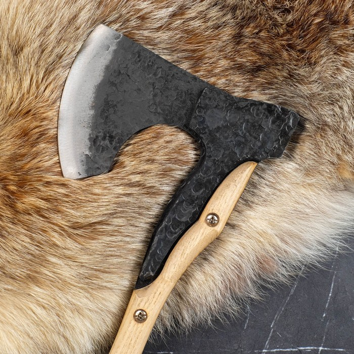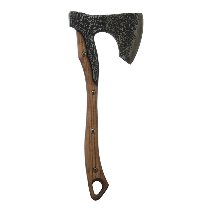 Изготавливается из цельнолистовой углеродистой конструкционной стали марки ст45. Толщина стали – 6мм. Режущая кромка имеет базовую заточку с длиной лезвия 11см. Рукоятка изготовлена из ясеня, обработана маслом и имеет удобный хват. Топорище имеет удлинённую переднюю часть для защиты рукоятки от повреждения во время рубки. Заготовки проходят закалку в горне, а затем отковываются на механическом молоте и вручную. Рабочее лезвие защищено от ржавчины покрытием в технике “воронение”.