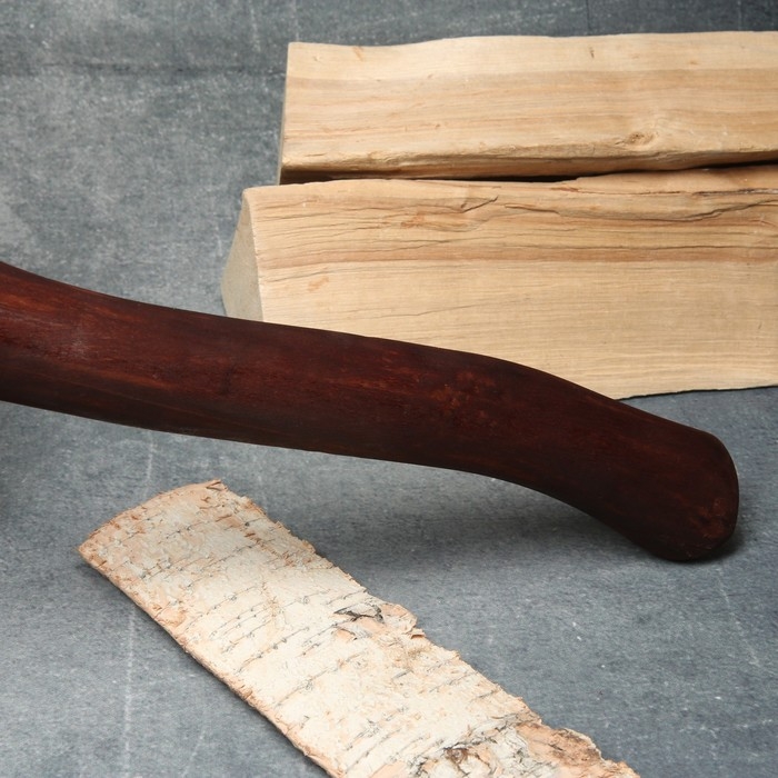 Топорище выполнено из высшего сорта березы, покрыто морилкой цвета «дуб» и воском. Обёрнуто в транспортировочную термоусадочную плёнку.