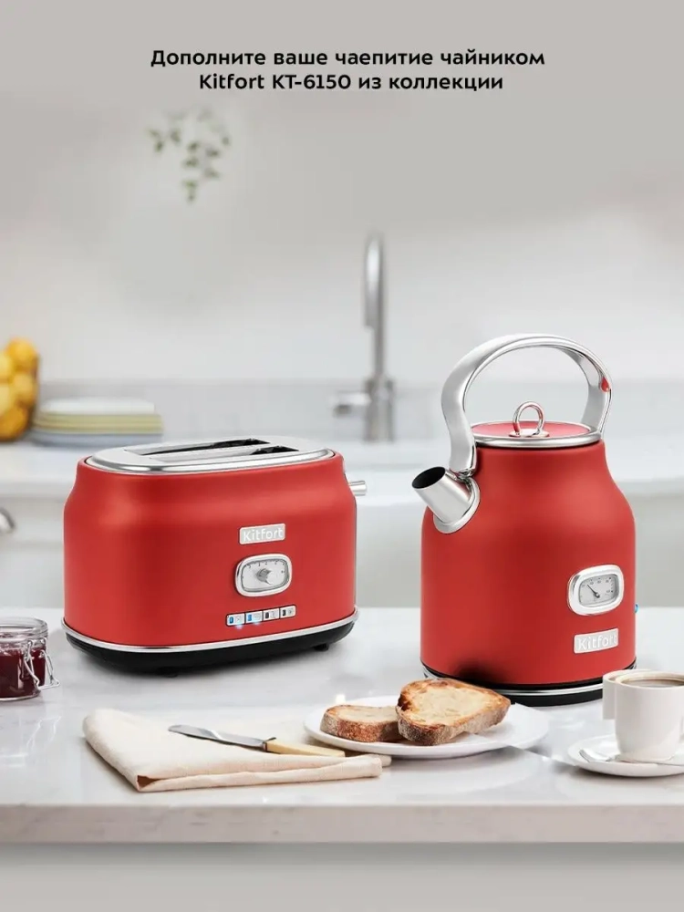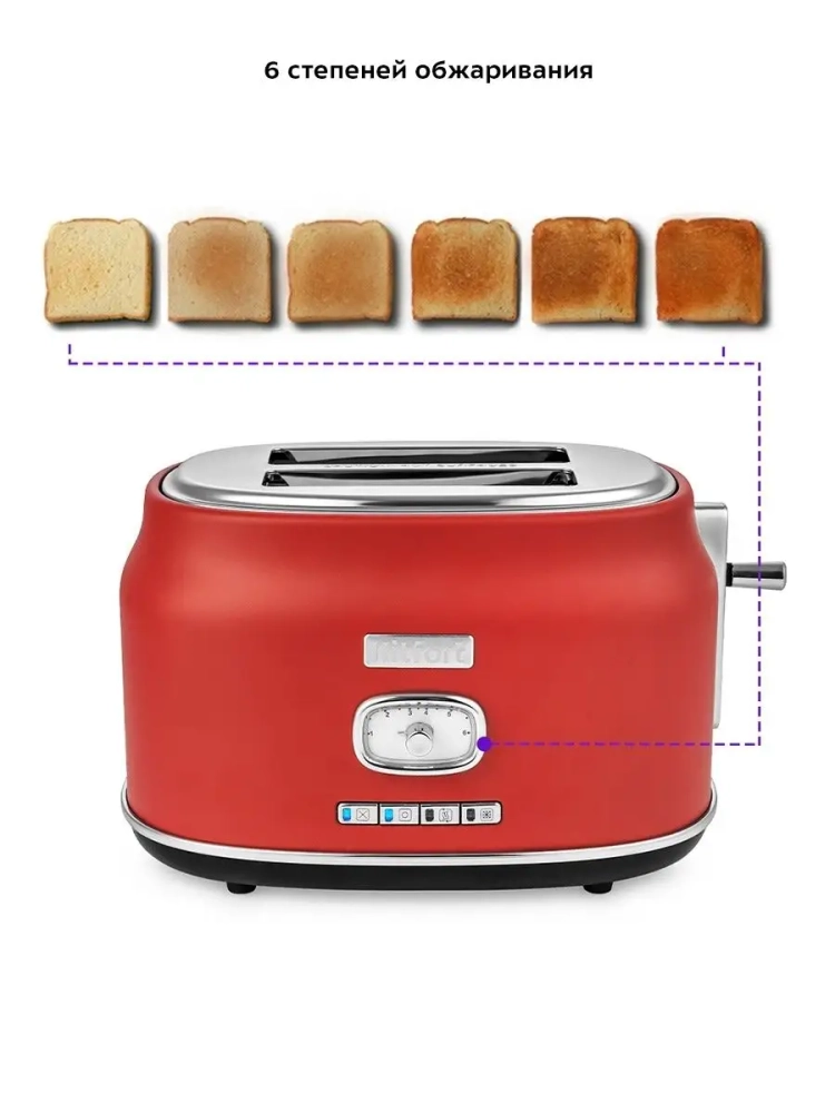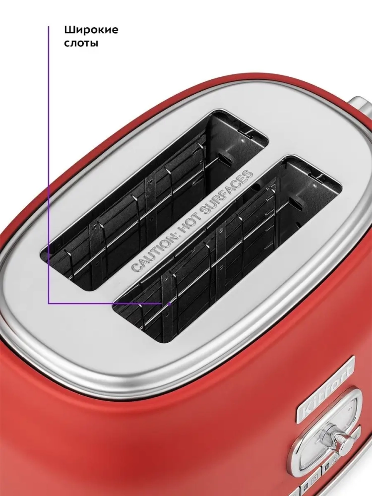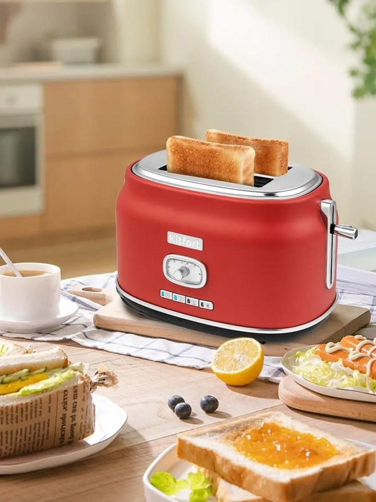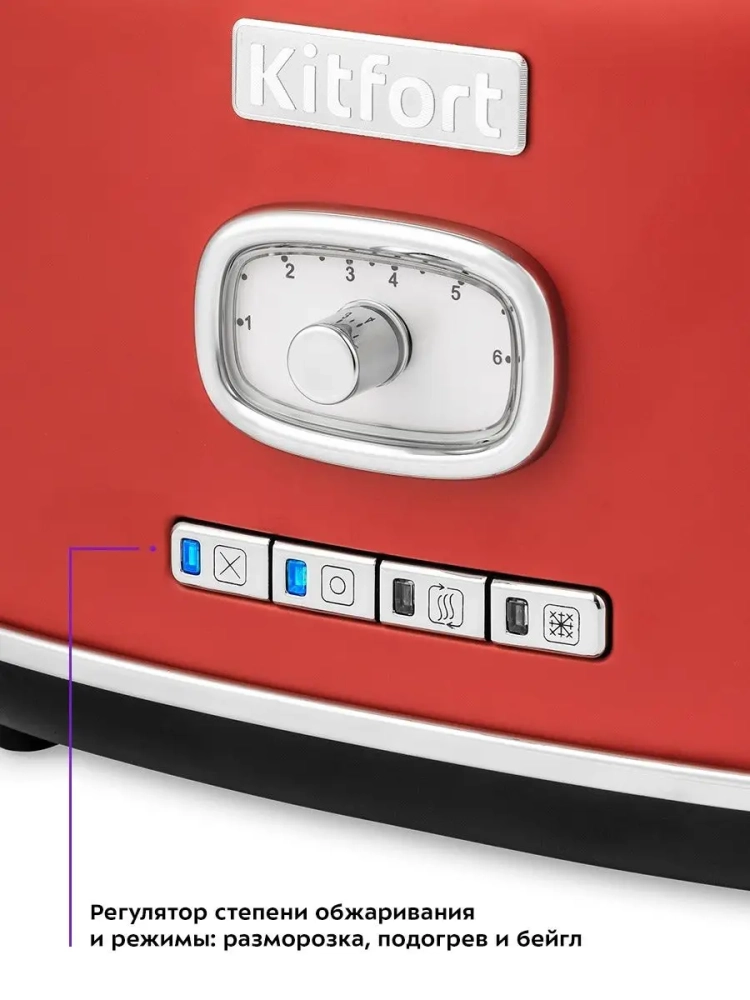 Тостер Китфорт оснащен поворотным регулятором степени обжаривания и четырьмя кнопками со световыми индикаторами. Режим подогрева служит для подогрева уже готовых тостов, если они остыли. Режим разморозки позволяет приготовить тосты из замороженного хлеба. Режим Бейгл позволяет поджарить рогалики или другие мучные изделия, которые требуют более интенсивной прожарки. Благодаря широким слотам можно поджаривать толстые куски хлеба, а не только тонкие. Загруженные тосты автоматически центрируются, чтобы их обжарка с двух сторон была равномерной независимо от толщины куска. По окончании приготовления тостер автоматически отключается, а тосты поднимаются вверх, чтобы их было удобнее извлечь. Вы можете приготовить 1 или 2 тоста одновременно.