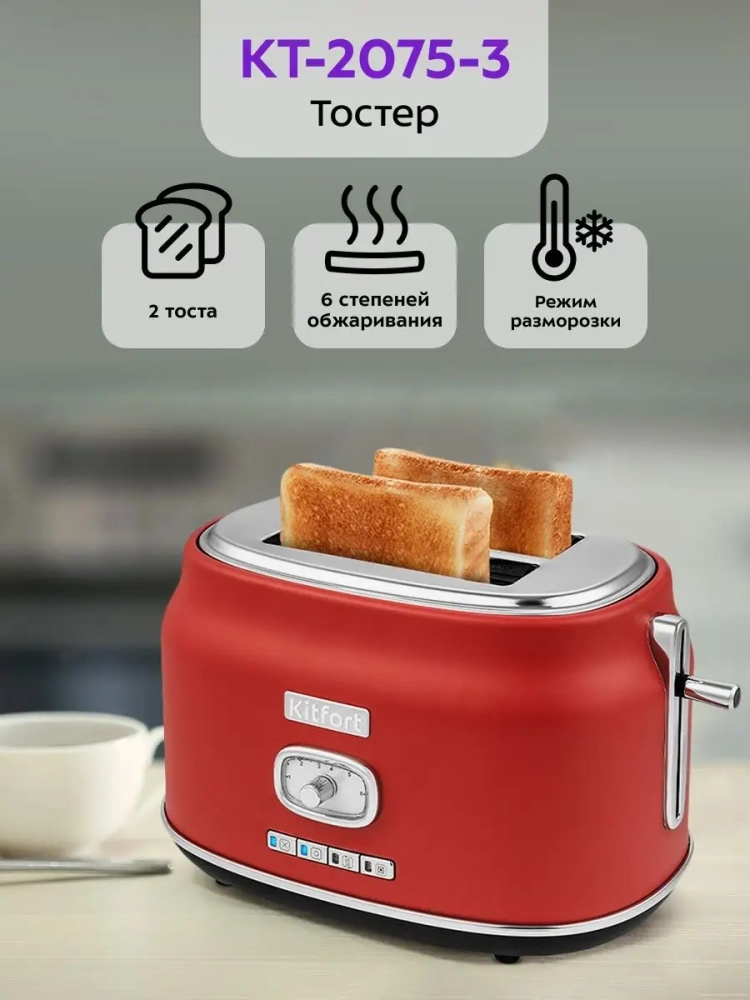 Электрический тостер Kitfort КТ-2075 создан для тех, кто любит полакомиться ароматным и хрустящим горячим поджаренным хлебом. Особый вкус и цвет корочки тостов получаются такими благодаря карамелизации сахара, содержащегося в муке, при инфракрасном нагреве в процессе приготовления.