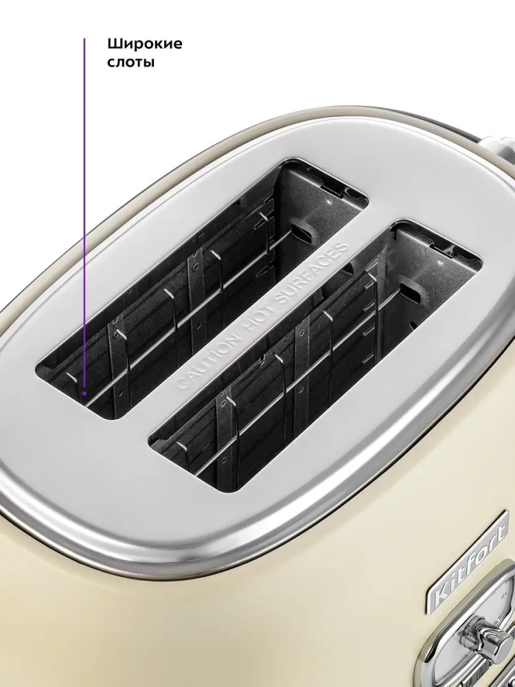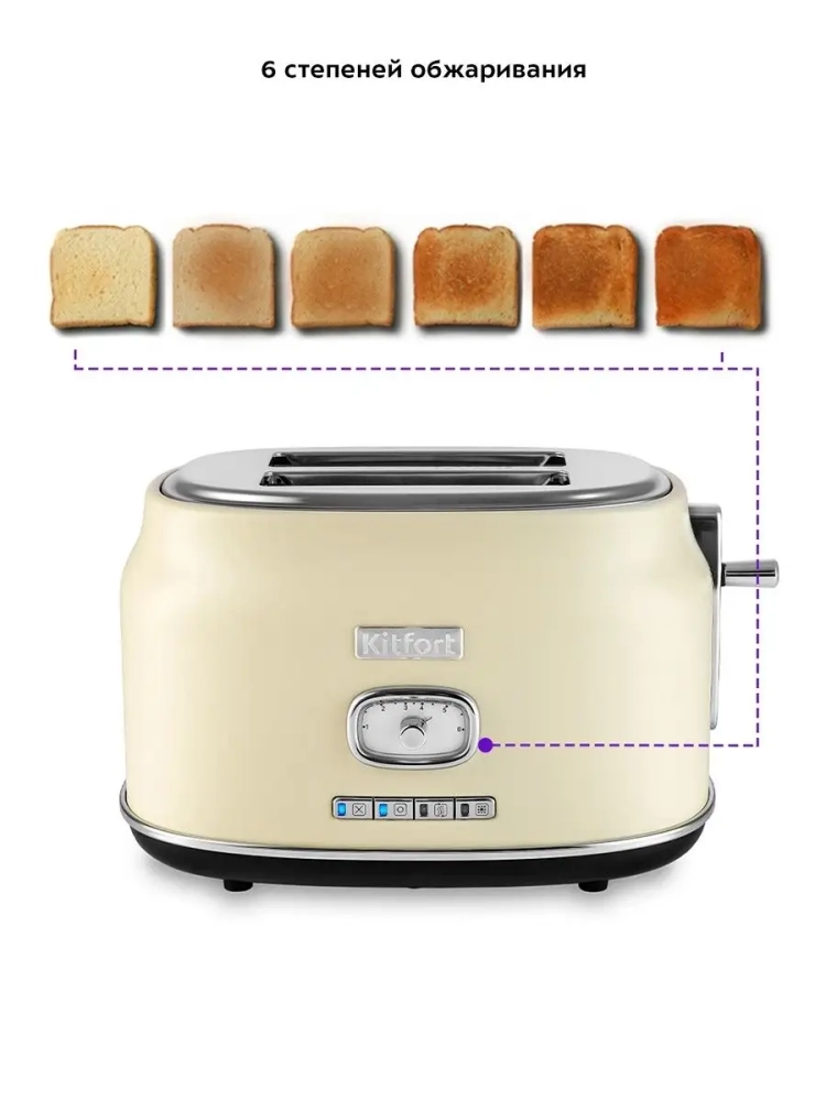 Тостер Китфорт оснащен поворотным регулятором степени обжаривания и четырьмя кнопками со световыми индикаторами. Режим подогрева служит для подогрева уже готовых тостов, если они остыли. Режим разморозки позволяет приготовить тосты из замороженного хлеба. Режим Бейгл позволяет поджарить рогалики или другие мучные изделия, которые требуют более интенсивной прожарки. Благодаря широким слотам можно поджаривать толстые куски хлеба, а не только тонкие. Загруженные тосты автоматически центрируются, чтобы их обжарка с двух сторон была равномерной независимо от толщины куска. По окончании приготовления тостер автоматически отключается, а тосты поднимаются вверх, чтобы их было удобнее извлечь. Вы можете приготовить 1 или 2 тоста одновременно.
