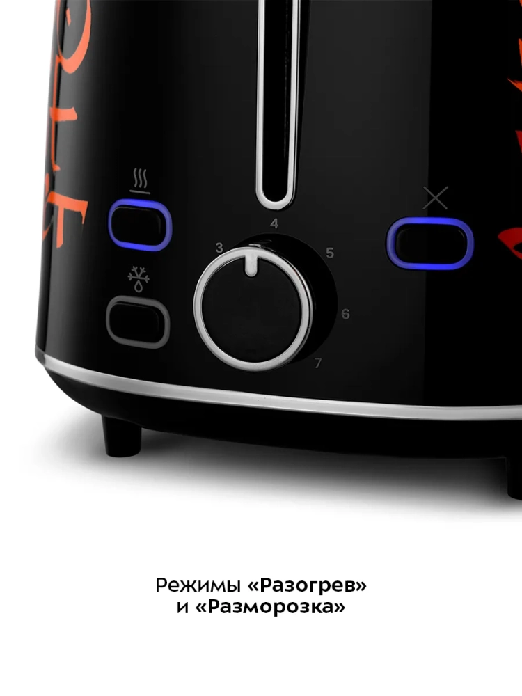 Тостер оснащен регулятором степени обжаривания и тремя кнопками со световыми индикаторами. Режим «Разогрев» служит для подогрева уже готовых тостов, если они остыли. Режим «Разморозка» позволяет приготовить тосты из замороженного хлеба. По окончании приготовления тостер автоматически отключается, а тосты поднимаются вверх, чтобы их было удобнее извлечь.