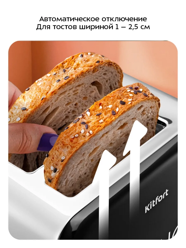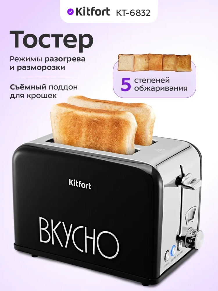 Электрический тостер Kitfort КТ-6832 создан для тех, кто любит полакомиться ароматным и хрустящим поджаренным хлебом. Особый вкус и цвет корочки тостов получаются такими благодаря карамелизации сахара, содержащегося в муке, при инфракрасном нагреве в процессе приготовления.