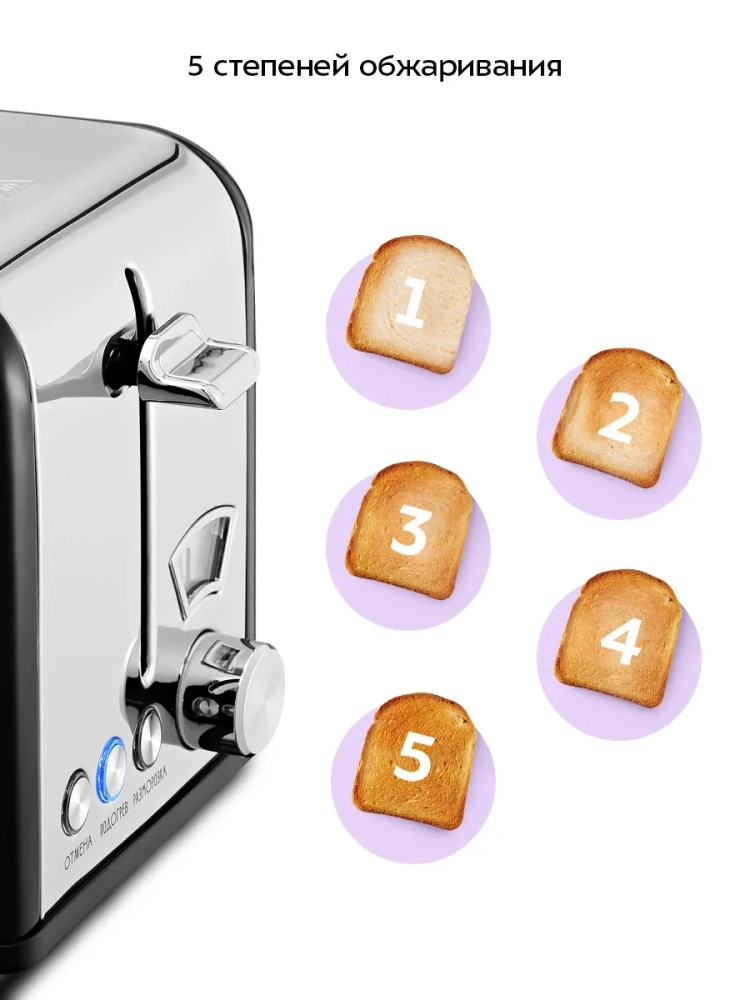 Тостер оснащен регулятором степени обжаривания и тремя кнопками со световыми индикаторами. Режим «Подогрев» служит для подогрева уже готовых тостов, если они остыли. Режим «Разморозка» позволяет приготовить тосты из замороженного хлеба. По окончании приготовления тостер автоматически отключается, а тосты поднимаются вверх, чтобы их было удобнее извлечь.