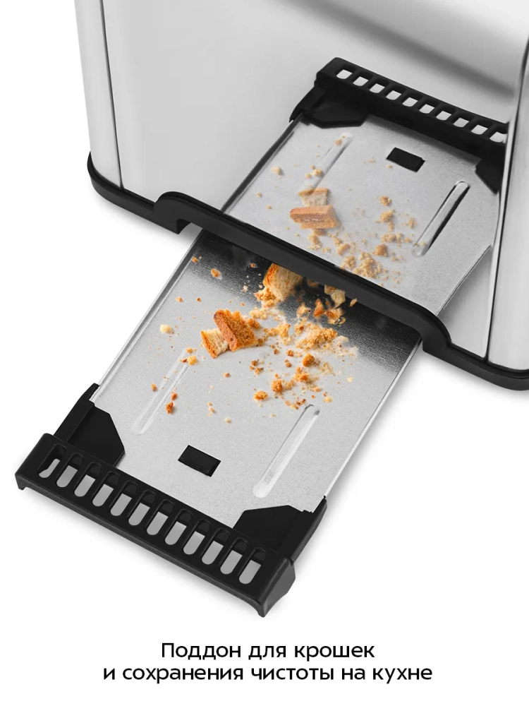 Корпус прибора выполнен из пластика. Съемный поддон для крошек позволяет легко очистить тостер от хлебных крошек. Для удобного хранения на дне устройства предусмотрены держатели для шнура питания.