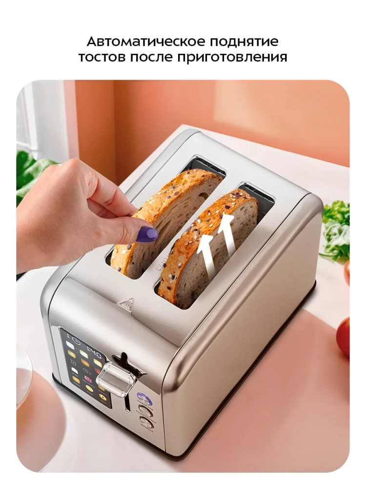 Тостер оснащен панелью управления с сенсорными кнопками и дисплеем. В данной модели предусмотрено 6 программ для обжаривания различных мучных изделий: «Белый», «Без глютена», «Зерновой», «Вафли», «Булка», «Бейгл». Программы отличаются временем приготовления: для получения желаемой степени обжаривания разную выпечку необходимо поджаривать разное время. Для каждой программы можно выбрать одну из 6 степеней обжаривания. Вы также можете изменить предустановленное время приготовления на 15 секунд в большую или меньшую сторону вручную. Специальная кнопка позволяет скорректировать нагрев и избежать пережаривания хлеба, если вы используете только один слот. Режим подогрева служит для подогрева уже готовых тостов, если они остыли. Режим разморозки позволяет приготовить тосты из замороженного хлеба.