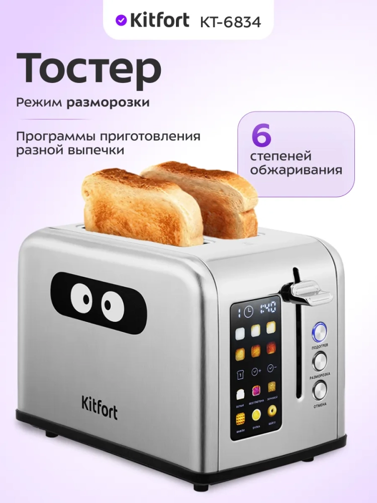 Электрический тостер Kitfort КТ-6834 создан для тех, кто любит ароматный и хрустящий горячий поджаренный хлеб. Особый вкус и цвет корочки тостов получаются такими благодаря карамелизации содержащегося в хлебе сахара при инфракрасном нагреве в процессе приготовления.