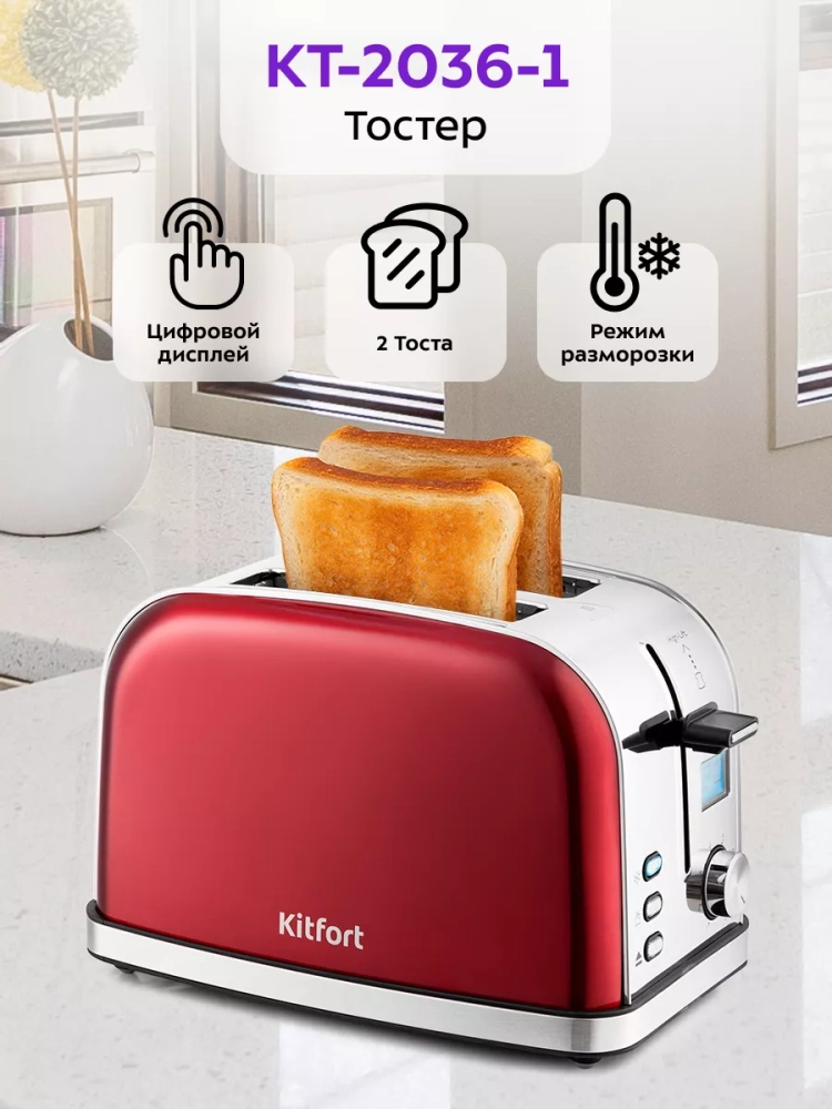 Электрический тостер Kitfort КТ-2036 создан для тех, кто любит полакомиться ароматным и хрустящим горячим поджаренным хлебом. Особый вкус и цвет корочки тостов получаются такими благодаря карамелизации сахара, содержащегося в муке, при инфракрасном нагреве в процессе приготовления. Тостер оснащен поворотным регулятором степени обжаривания, тремя кнопками со световыми индикаторами и жидкокристаллическим дисплеем. Режим разогрева служит для разогрева уже готовых тостов, если они остыли. Режим разморозки позволяет приготовить тосты из замороженного хлеба. Загруженные тосты автоматически центрируются, чтобы их обжарка с двух сторон была равномерной. Оставшееся время показывается на жидкокристаллическом дисплее и позволяет рассчитать приготовление чашки кофе или чая, пока готовится тост. По окончании приготовления тостер автоматически отключается, а тосты поднимаются вверх, чтобы их было удобнее извлечь. Вы можете приготовить 1 или 2 тоста одновременно.