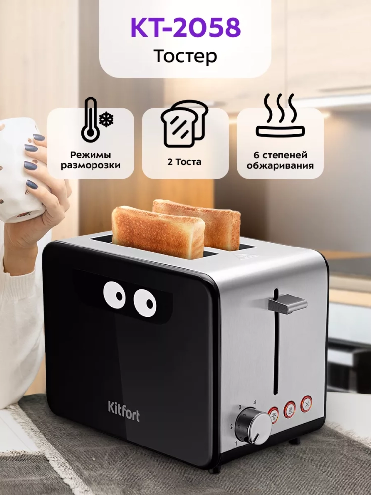 Тостер Kitfort КТ-2058 создан для тех, кто любит полакомиться ароматным и хрустящим поджаренным хлебом. Особый вкус и цвет корочки тостов получаются такими благодаря карамелизации сахара, содержащегося в муке, при инфракрасном нагреве в процессе приготовления. Тостер оснащен регулятором степени поджаривания. Благодаря шести степеням поджаривания вы можете приготовить горячие тосты на любой вкус и из любых видов хлеба. Режимы «Подогрев» и «Разморозка» позволяют разогреть уже готовые тосты, если они остыли, и приготовить тосты даже из замороженного хлеба. Широкие слоты для тостов позволяют поджаривать не только тонкие ломтики хлеба, но и толстые. Загруженные тосты автоматически центрируются, чтобы их поджарка с двух сторон была равномерной независимо от толщины ломтика. По окончании приготовления тостер автоматически отключается, а тосты поднимаются вверх, чтобы их было удобнее извлечь. Механизм экстраподъема позволяет приподнять тосты выше для удобного извлечения тостов небольшого размера. Вы можете приготовить 1 или 2 тоста одновременно. В нижней части корпуса тостера расположен выдвижной поддон для крошек, поэтому чистить тостер просто и удобно.