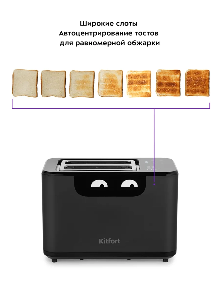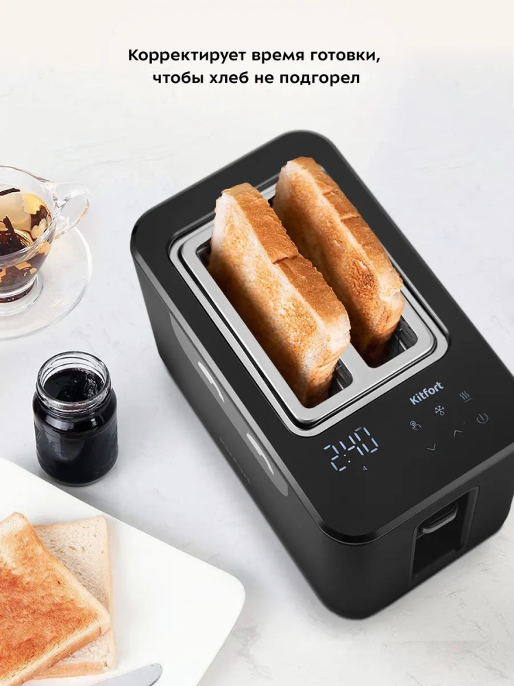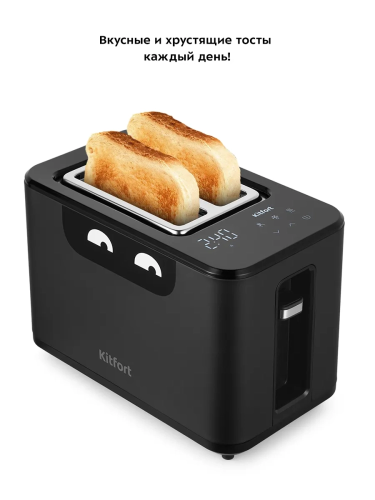 Тостер оснащен сенсорной панелью управления с шестью кнопками и может работать в нескольких режимах. Режим подогрева поможет разогреть уже готовые, но остывшие тосты. Режим разморозки предназначен для приготовления тостов из замороженного хлеба. С помощью предустановленного режима можно не тратить каждый раз время на установку степени обжаривания тостов. Широкие слоты позволяют равномерно поджарить куски хлеба разной толщины.