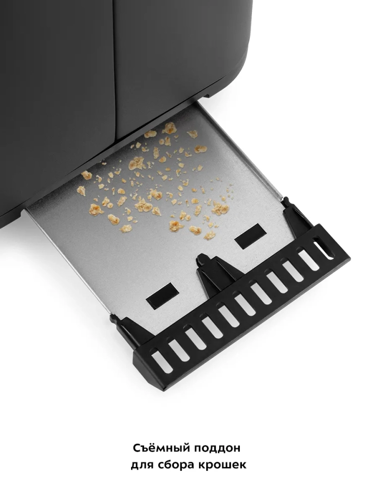 Тосты независимо от их толщины всегда располагаются посередине между нагревателями и поэтому обжариваются равномерно с обеих сторон. При нескольких использованиях подряд тостер автоматически корректирует время, чтобы хлеб не подгорел. По окончании приготовления тостер подаст звуковой сигнал, а тосты поднимутся вверх, чтобы их было удобнее извлечь. Съемный поддон для крошек позволяет легко и удобно очистить тостер от хлебных крошек.