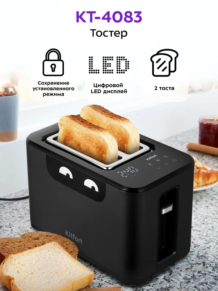 Электрический тостер Kitfort КТ-4083 создан для тех, кто любит полакомиться ароматным и хрустящим горячим поджаренным хлебом. Особый вкус и цвет корочки тостов получаются такими благодаря карамелизации сахара, содержащегося в муке, при инфракрасном нагреве в процессе приготовления.