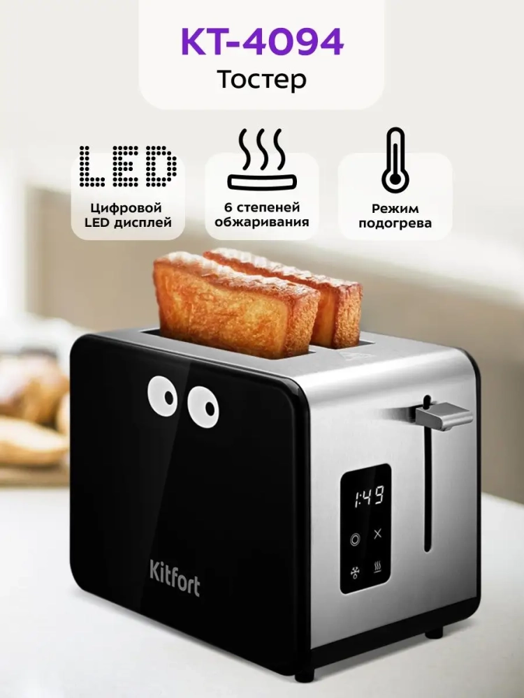 Электрический тостер Kitfort КТ-4094 создан для тех, кто любит полакомиться ароматным и хрустящим горячим поджаренным хлебом. Особый вкус и цвет корочки тостов получаются такими благодаря карамелизации сахара, содержащегося в хлебе, при инфракрасном нагреве в процессе приготовления.