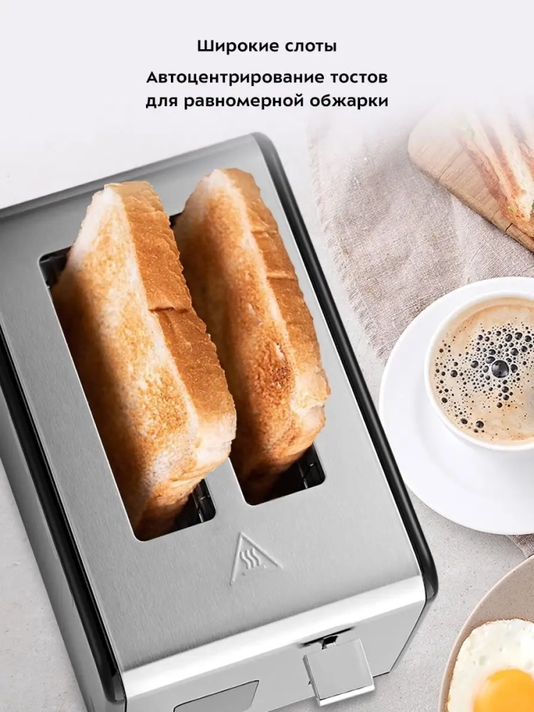 По окончании приготовления тостер автоматически отключается, а тосты поднимаются вверх, чтобы их было удобнее извлечь. Механизм экстра-подъема позволяет приподнять выше тосты небольшого размера для их удобного извлечения. Вы можете приготовить 1 или 2 тоста одновременно.