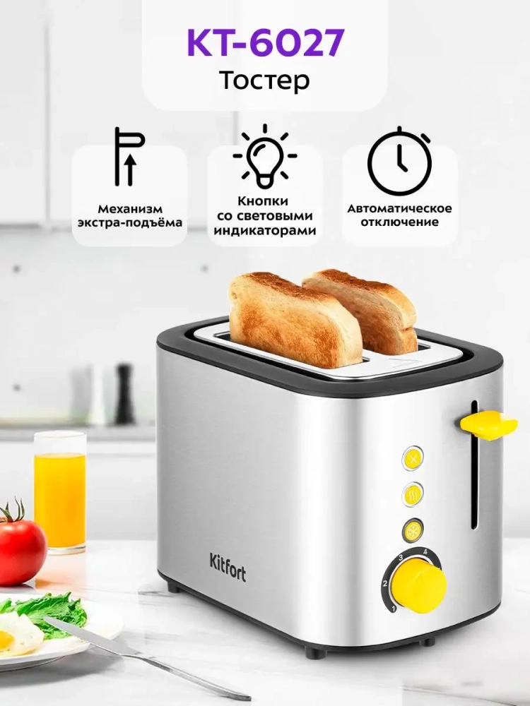 Тостер Китфорт КТ-6027 предназначен для приготовления тостов в домашних условиях и может применяться в квартирах, загородных домах, клиентами в гостиничных номерах, бытовых помещениях магазинов, офисов и т.п. для некоммерческой эксплуатации.