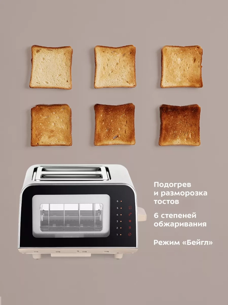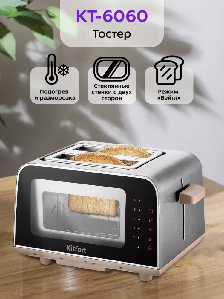 Электрический тостер Kitfort КТ-6060 создан для тех, кто любит полакомиться ароматным и хрустящим горячим поджаренным хлебом. Особый вкус и цвет корочки тостов получаются такими благодаря карамелизации сахара, содержащегося в муке, при инфракрасном нагреве в процессе приготовления. Благодаря стеклянным панелям с двух сторон тостера вы можете наблюдать за процессом приготовления. Тостер оснащен сенсорной панелью управления и может работать в нескольких режимах. Режим «Подогрев» служит для подогрева уже готовых тостов, если они остыли. Режим «Разморозка» позволяет приготовить тосты из замороженного хлеба. Режим «Бейгл» позволяет поджарить внутреннюю часть разрезанного пополам мучного изделия, в то же время внешняя поверхность не пригорит. Загруженные тосты автоматически центрируются, чтобы их обжарка с двух сторон была равномерной независимо от толщины куска. По окончании приготовления тостер автоматически отключается, а тосты поднимаются вверх, чтобы их было удобнее извлечь. Механизм экстра-подъема позволяет приподнять выше тосты небольшого размера для их удобного извлечения. Вы можете приготовить 1 или 2 тоста одновременно. Съемный поддон для крошек позволяет легко и удобно очистить тостер от хлебных крошек. Тостер предназначен для приготовления тостов в домашних условиях и может применяться в квартирах, загородных домах, клиентами в гостиничных номерах, бытовых помещениях магазинов, офисов и т.п. для некоммерческой эксплуатации.