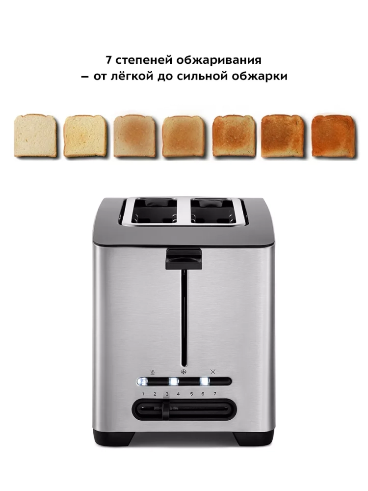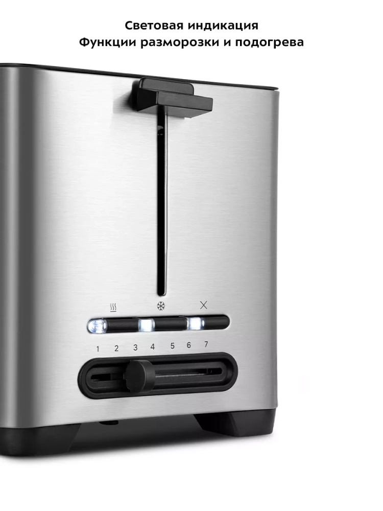 Тостер оснащен поворотным регулятором степени обжаривания и тремя кнопками со световыми индикаторами. Режим подогрева служит для подогрева уже готовых тостов, если они остыли, или подогрева холодного хлеба без обжаривания. Режим разморозки позволяет приготовить тосты из замороженного хлеба.