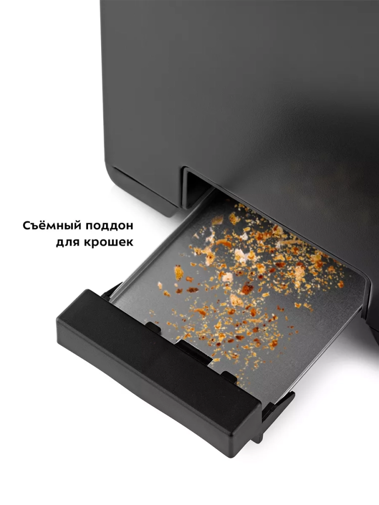 Снизу расположен съемный поддон для крошек, поэтому чистить тостер просто и удобно.