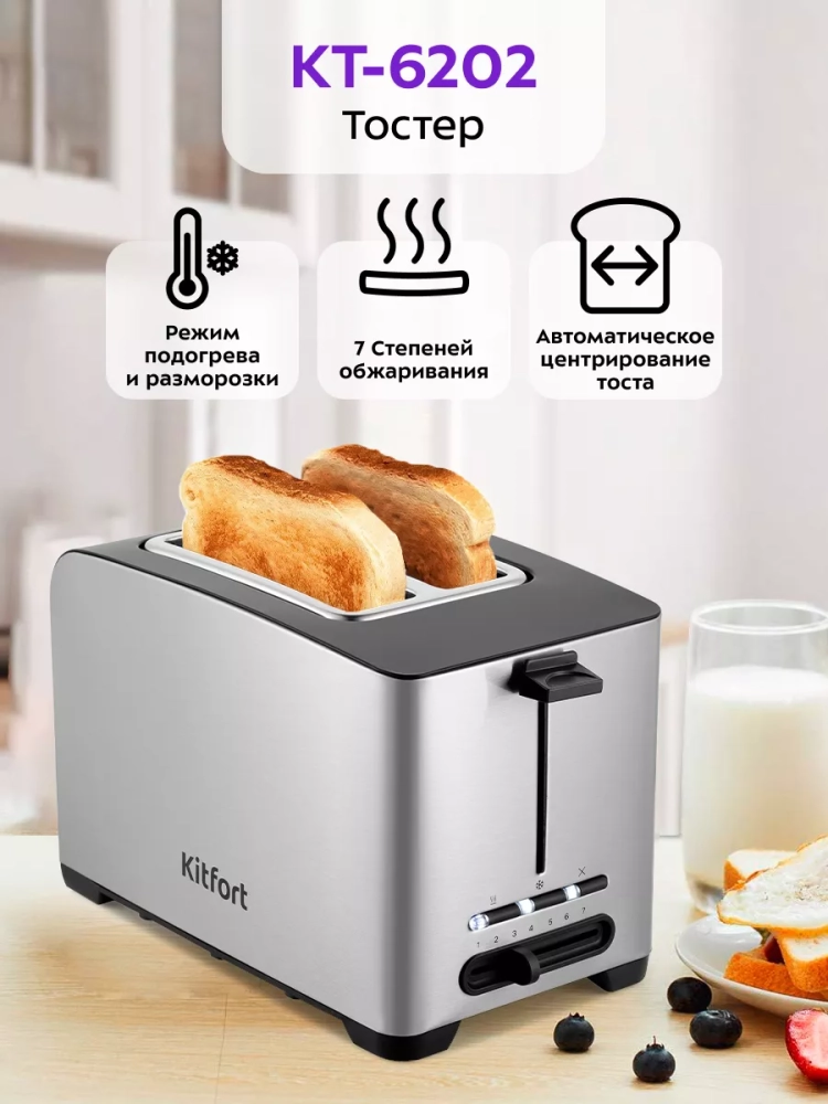Электрический тостер Kitfort КТ-6202 создан для тех, кто любит полакомиться ароматным и хрустящим горячим поджаренным хлебом. Особый вкус и цвет корочки тостов получаются такими благодаря карамелизации сахара, содержащегося в тесте, при инфракрасном нагреве в процессе приготовления.