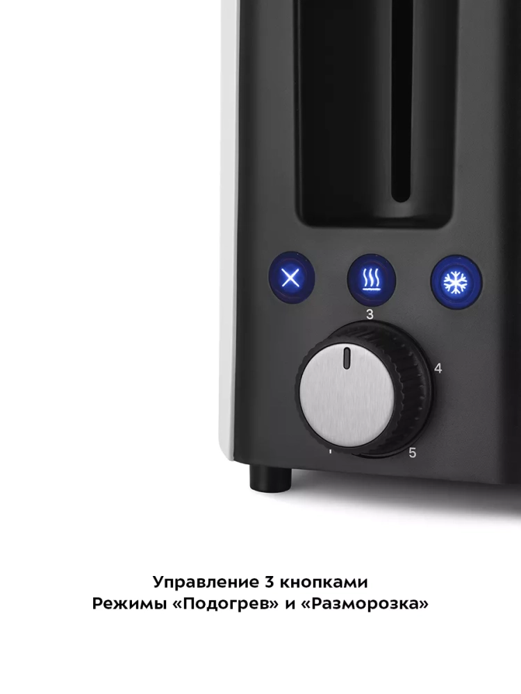 Тостер оснащен поворотным регулятором степени обжаривания и тремя кнопками со световыми индикаторами. Режим подогрева служит для подогрева уже готовых тостов, если они остыли, или подогрева холодного хлеба без обжаривания. Режим разморозки позволяет приготовить тосты из замороженного хлеба.