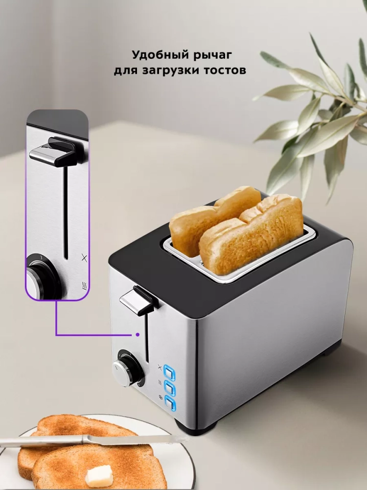 Тостер оснащен поворотным регулятором степени обжаривания и тремя кнопками со световыми индикаторами. Режим подогрева служит для подогрева уже готовых тостов, если они остыли, или подогрева холодного хлеба без обжаривания. Режим разморозки позволяет приготовить тосты из замороженного хлеба.
