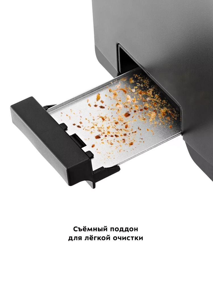 Снизу расположен съемный поддон для крошек, поэтому чистить тостер просто и удобно.