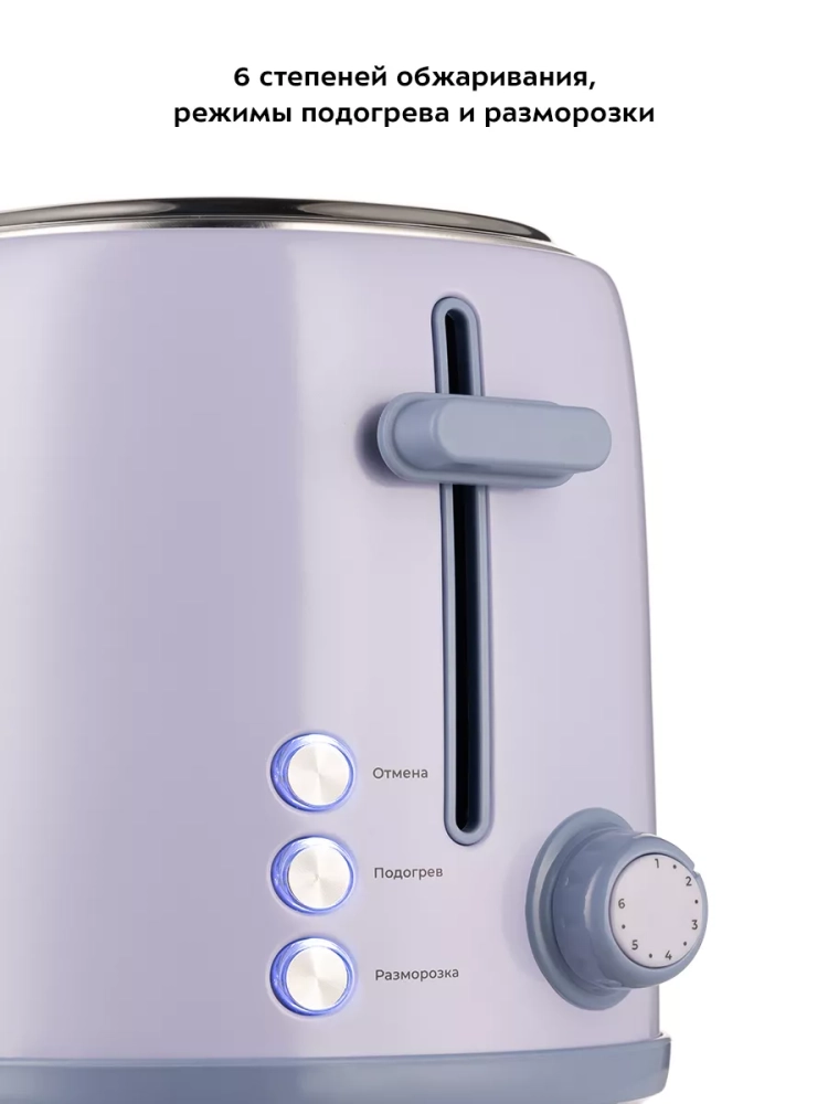 Тостер оснащен поворотным регулятором степени обжаривания и тремя кнопками. Режим подогрева служит для подогрева уже готовых тостов, если они остыли. Режим разморозки позволяет приготовить тосты из замороженного хлеба.