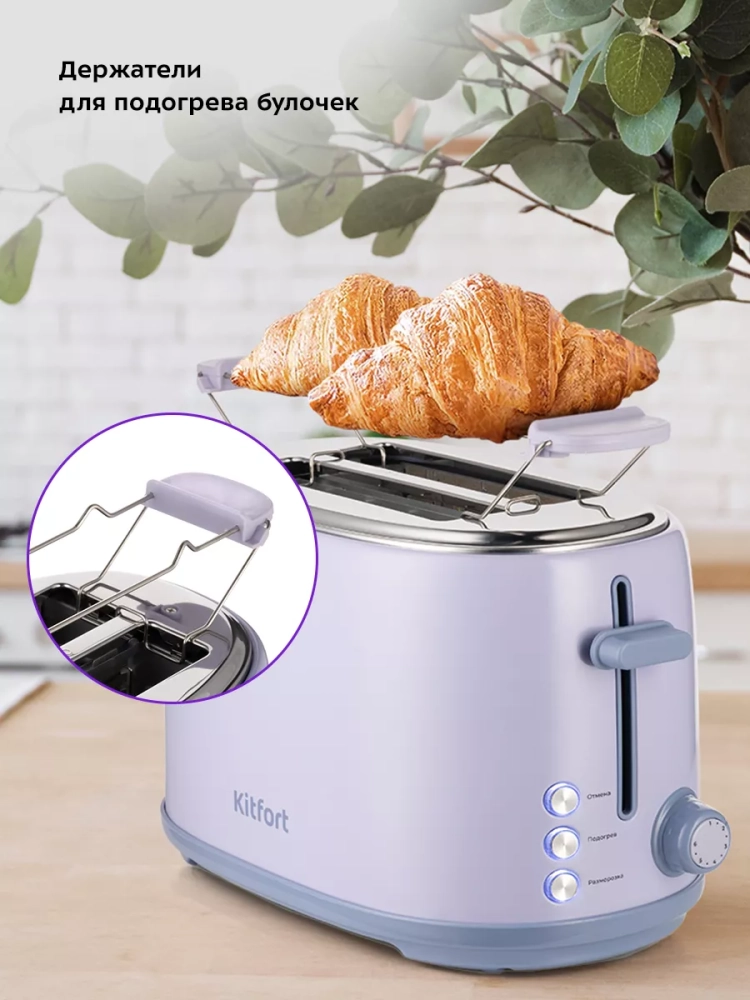 Загруженные тосты автоматически центрируются, чтобы их обжарка с двух сторон была равномерной независимо от толщины куска. Благодаря широким слотам можно поджаривать толстые куски хлеба, а не только тонкие. По окончании приготовления тостер автоматически отключается, а тосты поднимаются вверх, чтобы их было удобнее извлечь. Механизм экстра-подъема позволяет приподнять тосты выше для удобного извлечения тостов небольшого размера. Вы можете приготовить 1 или 2 тоста одновременно. Тостер имеет съемную подставку для подогрева, на которую мы можете положить булочки, круассаны и другую выпечку, чтобы подогреть их.