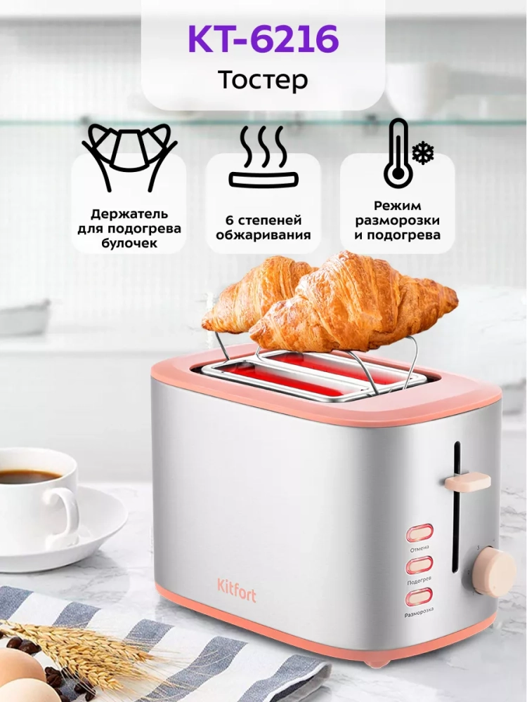 Тостер Kitfort КТ-6216 создан для тех, кто любит полакомиться ароматным и хрустящим горячим поджаренным хлебом. Особый вкус и цвет корочки тостов получаются такими благодаря карамелизации сахара, содержащегося в муке, при инфракрасном нагреве в процессе приготовления.