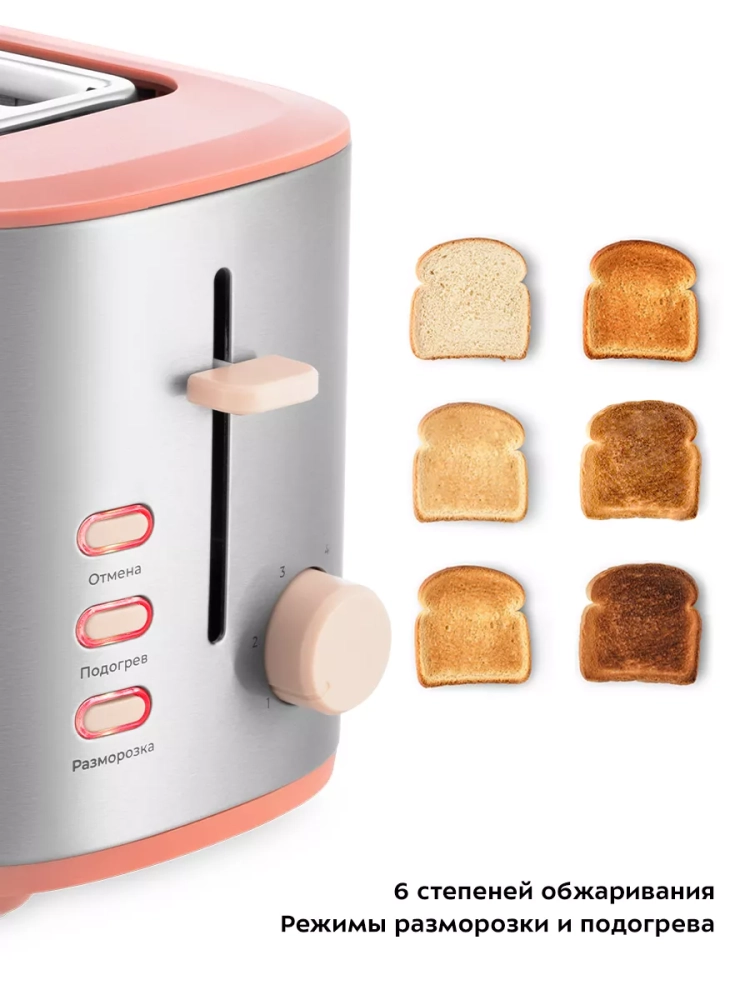 Тостер оснащен поворотным регулятором степени обжаривания и тремя кнопками. Режим подогрева служит для подогрева уже готовых тостов, если они остыли. Режим разморозки позволяет приготовить тосты из замороженного хлеба.